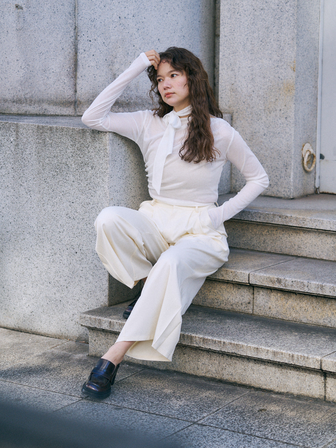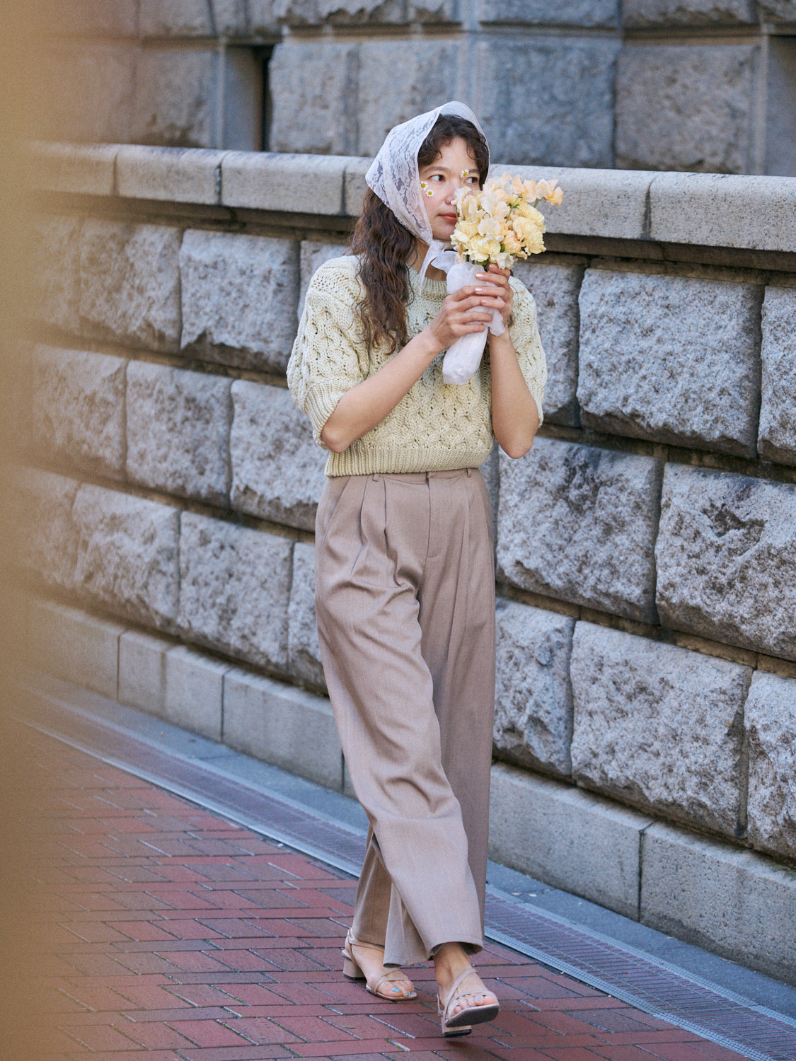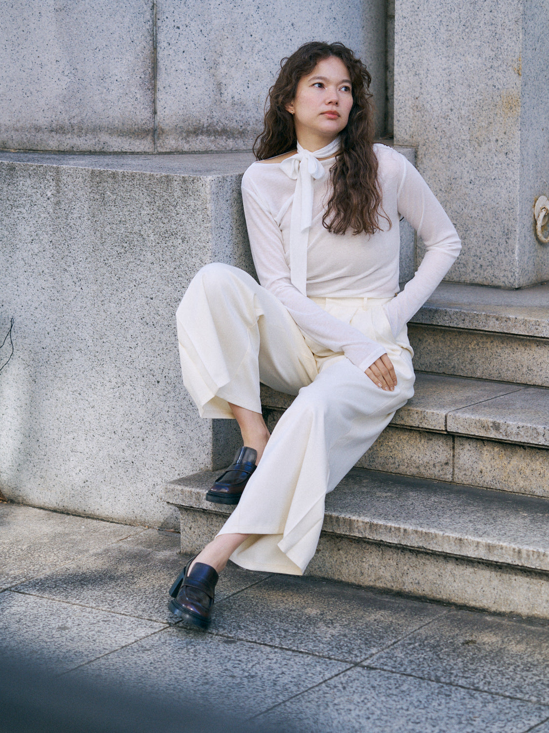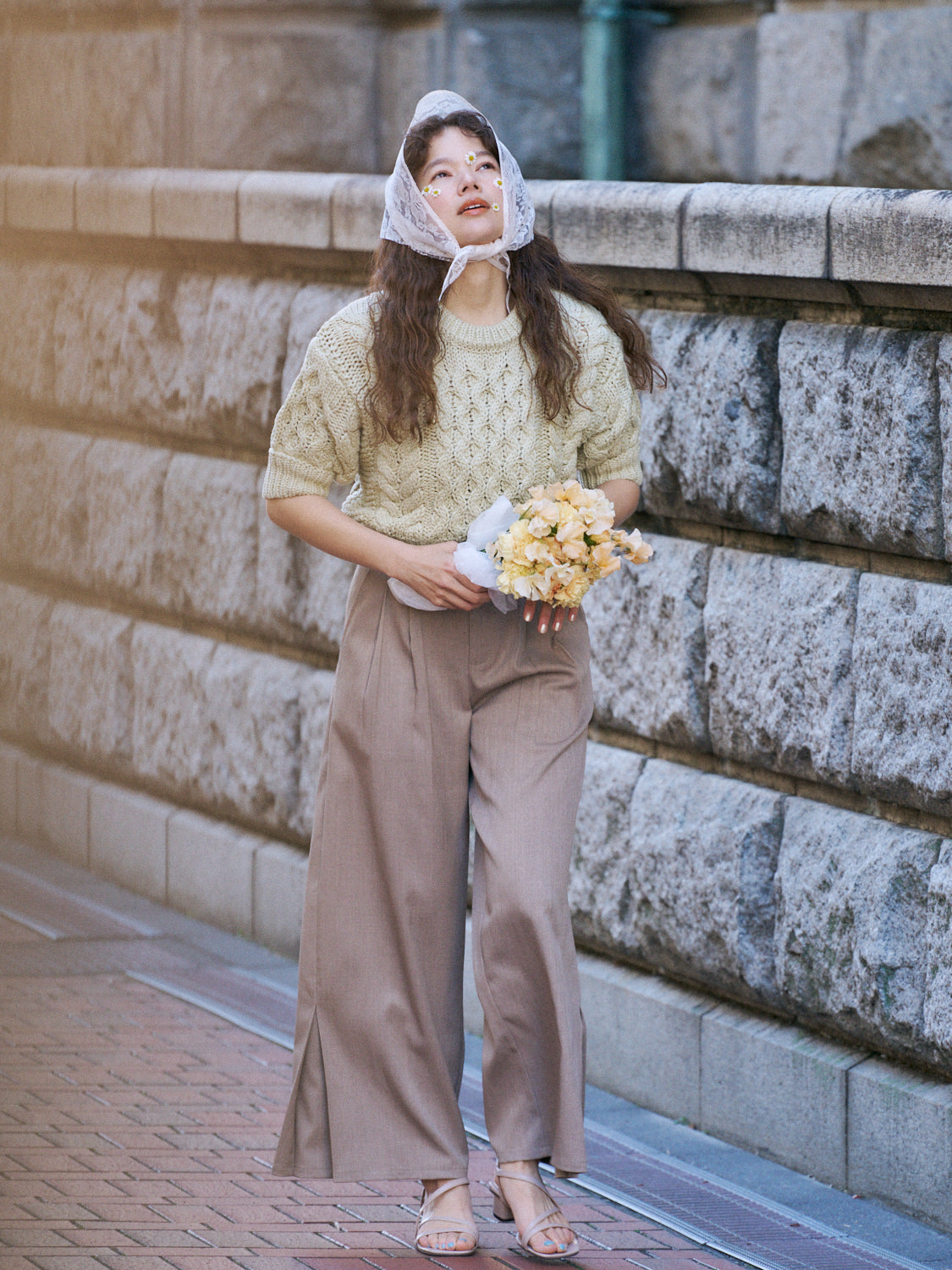 裾にスリットが入ることで、軽やかな抜け感を演出し、足元を美しく見せてくれます。