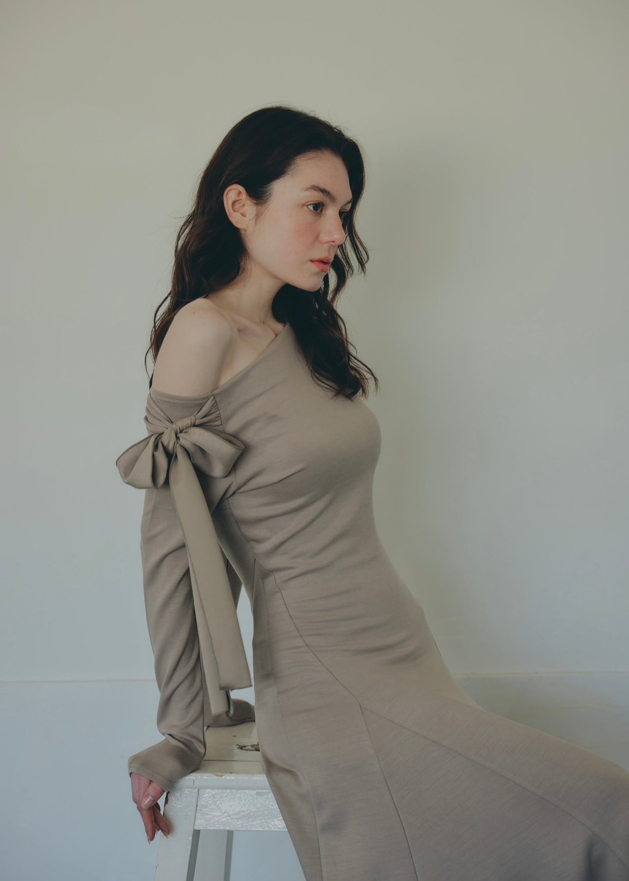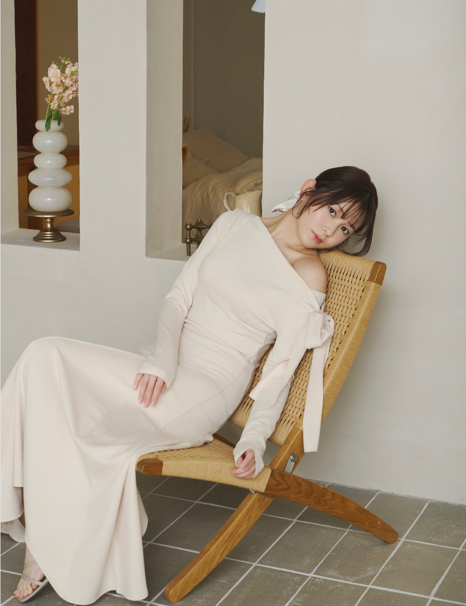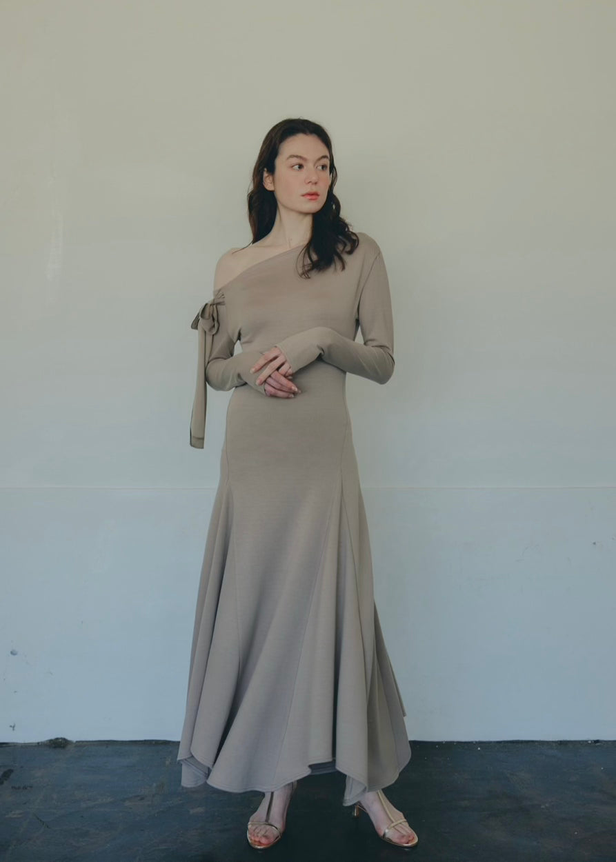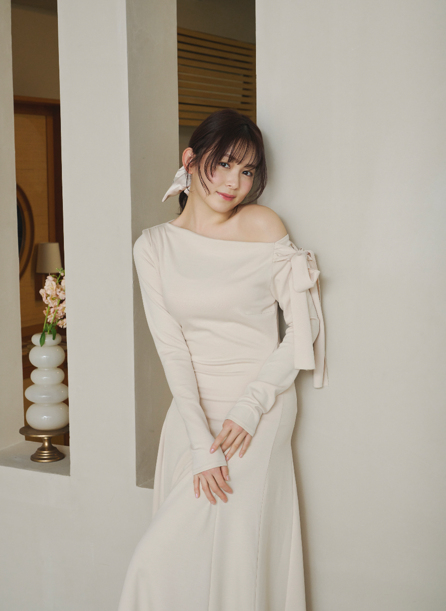 上品な抜け感を演出するワンショルダーデザインのワンピース。
