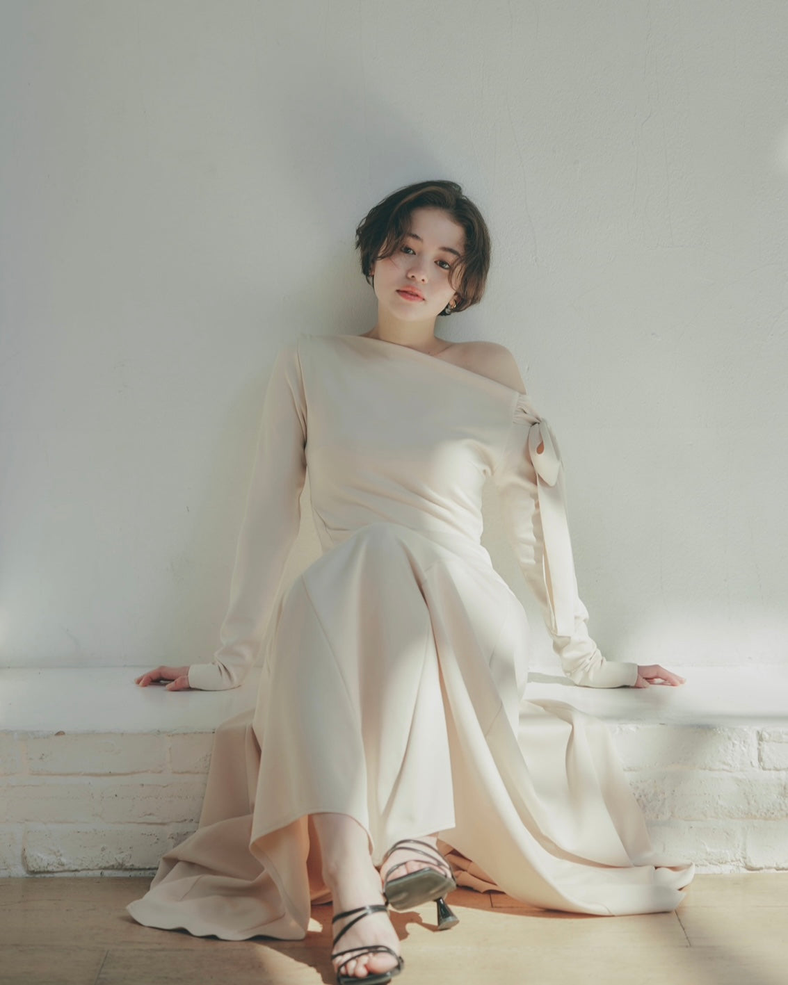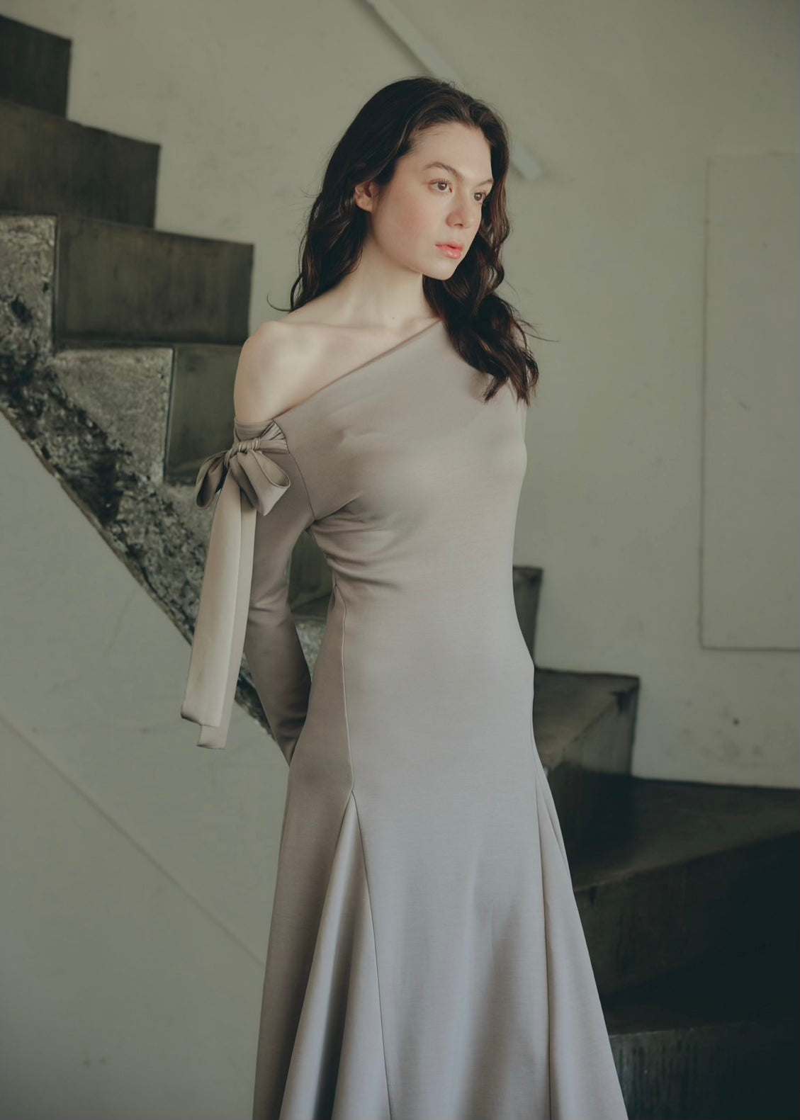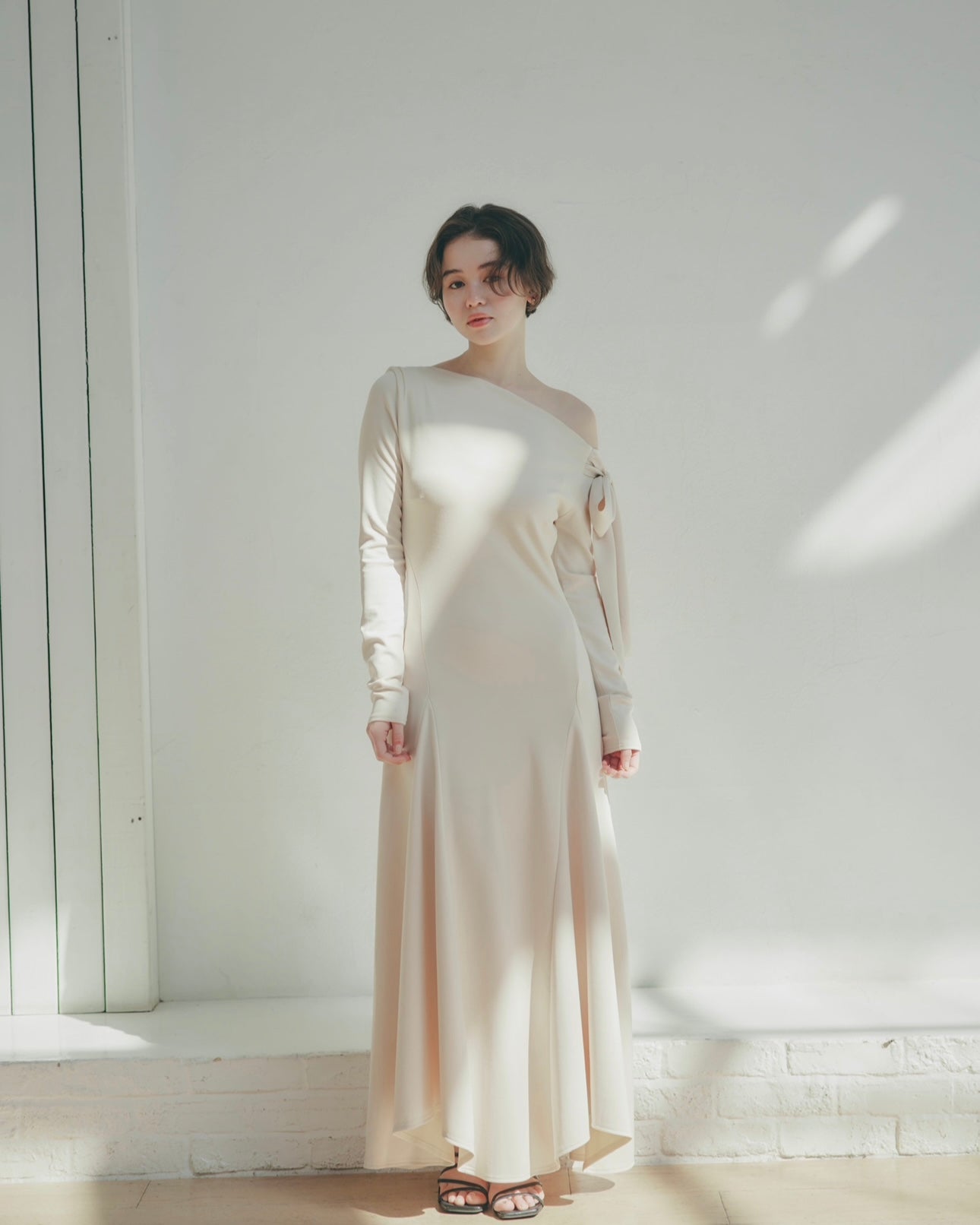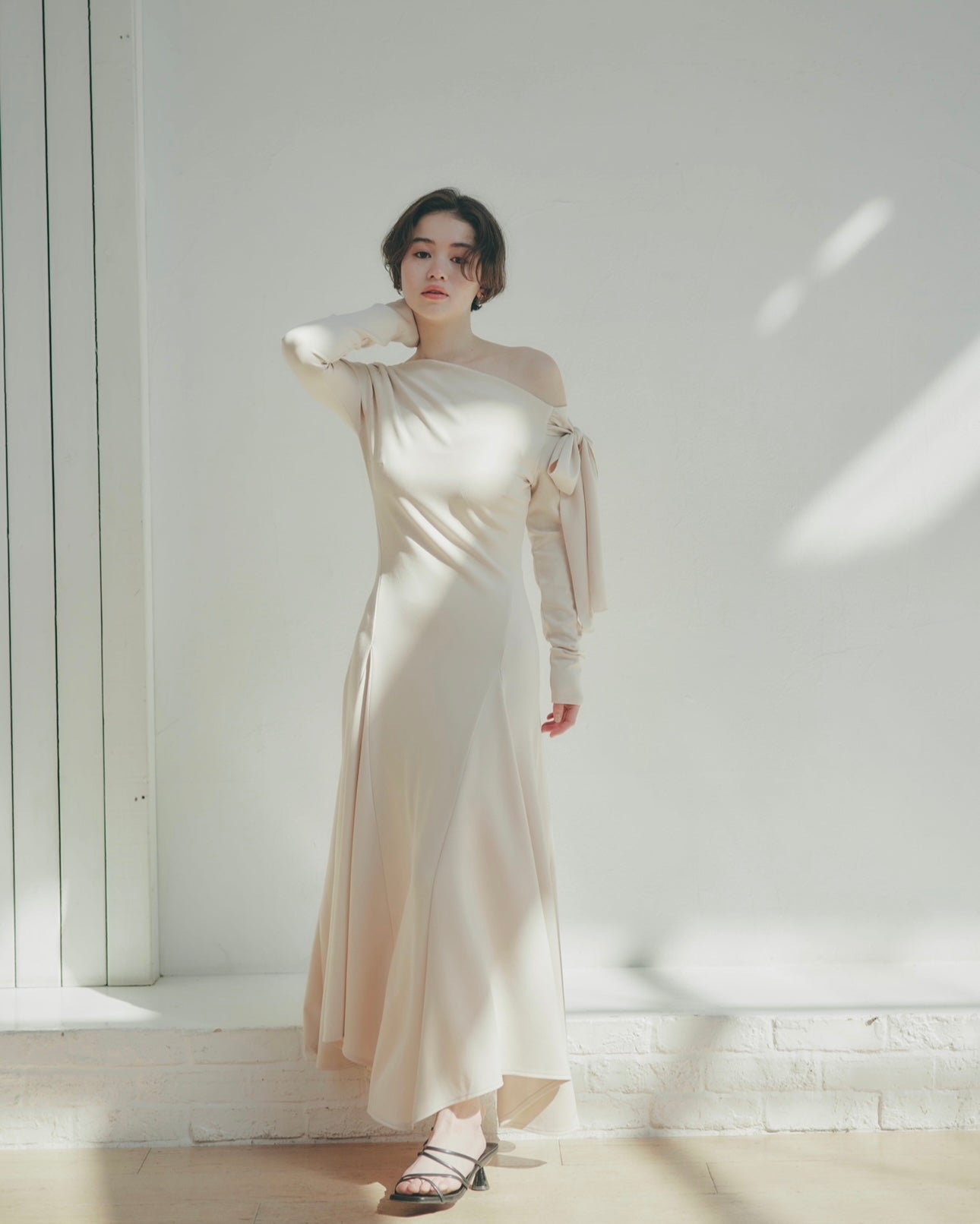上品な抜け感を演出するワンショルダーデザインのワンピース。