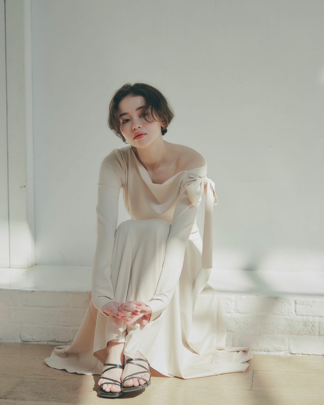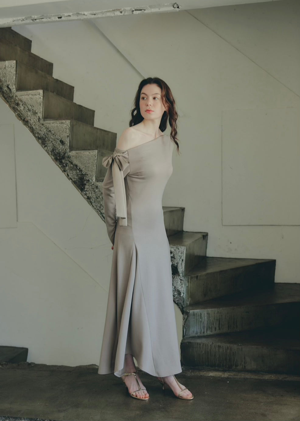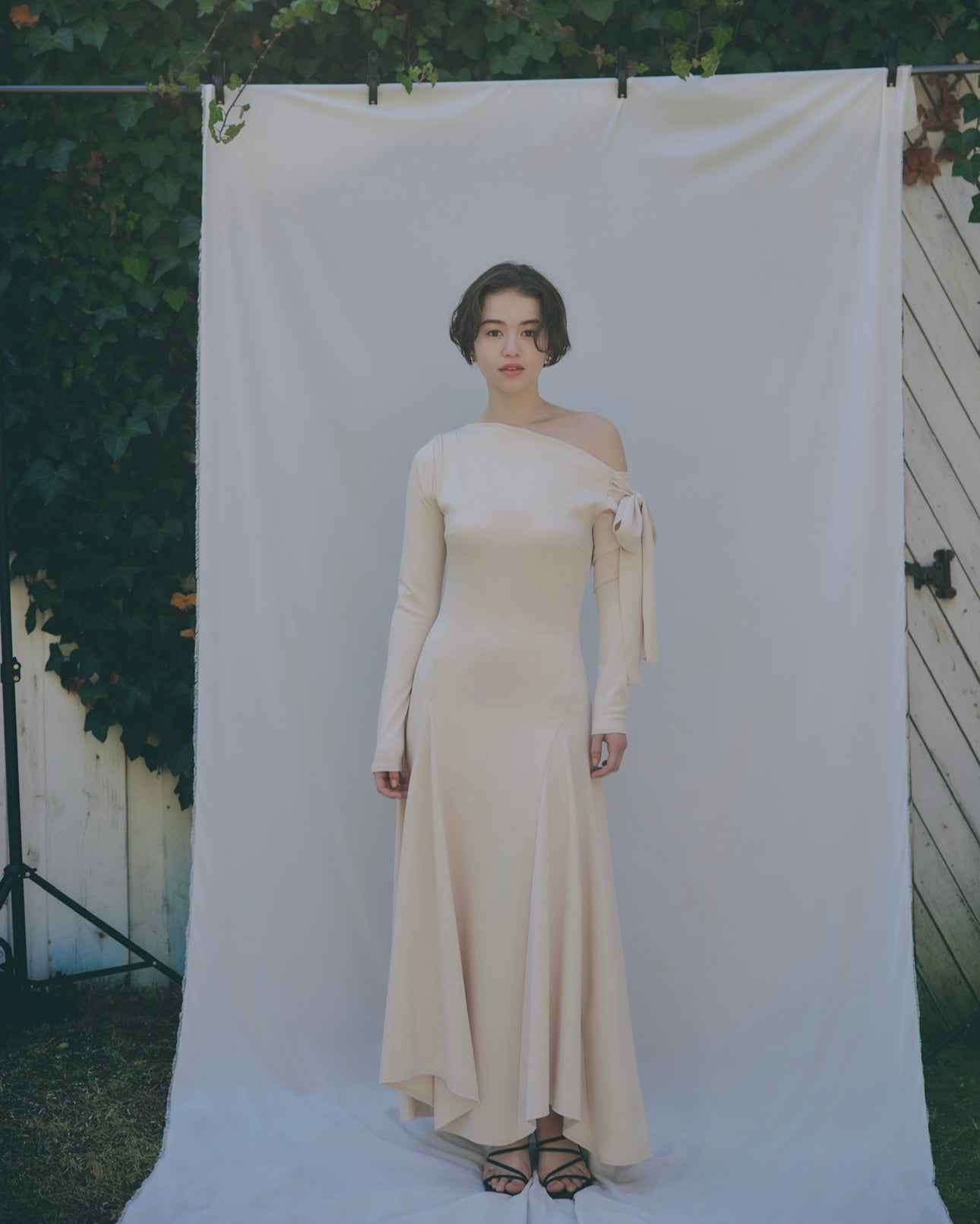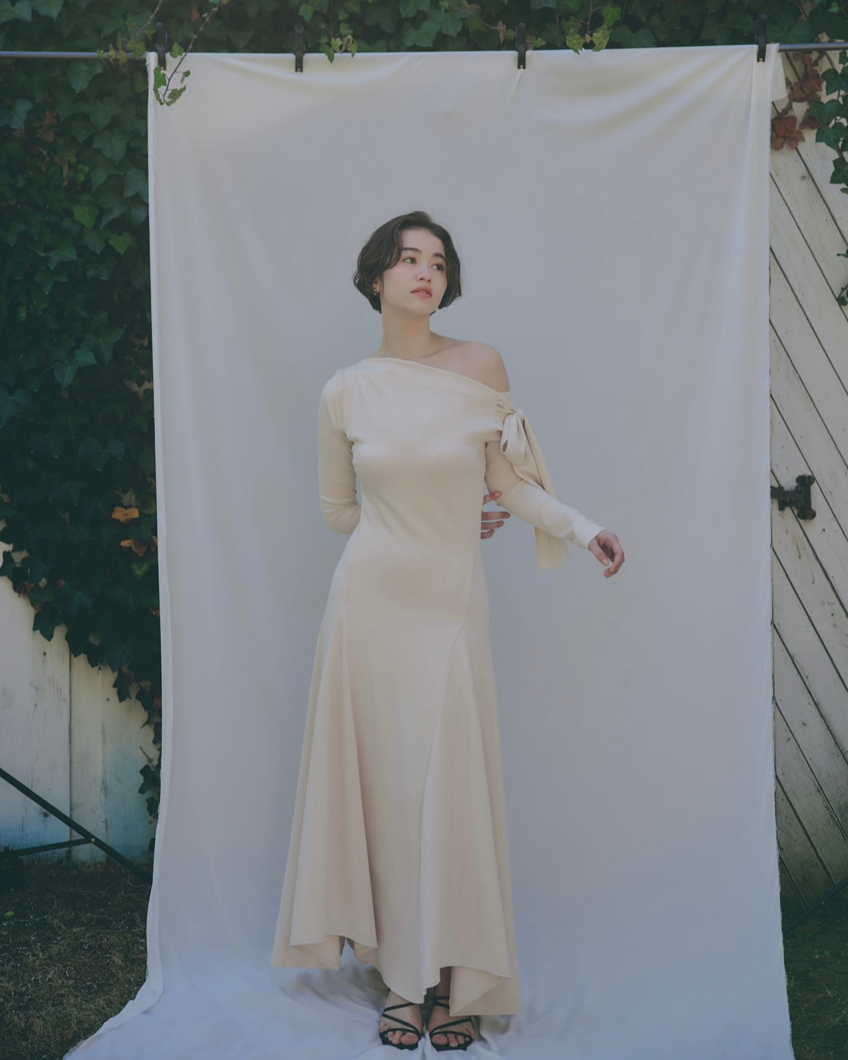 上品な抜け感を演出するワンショルダーデザインのワンピース。