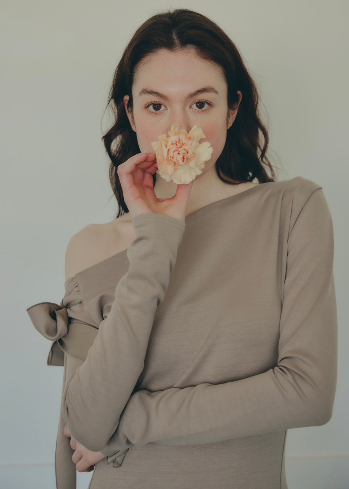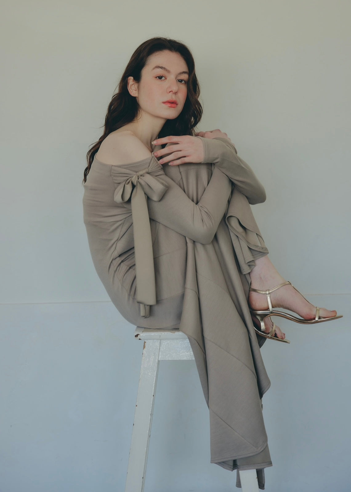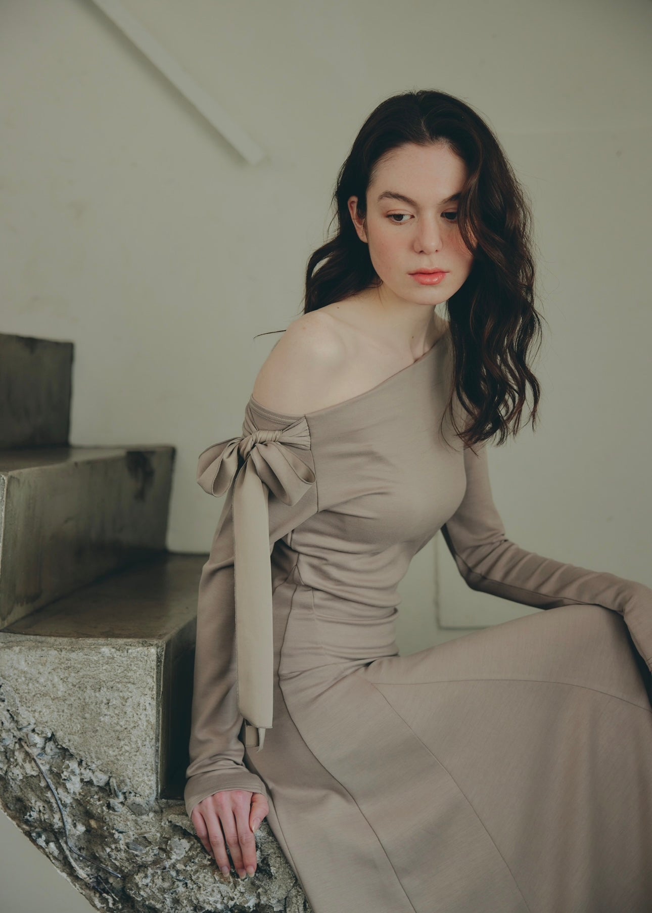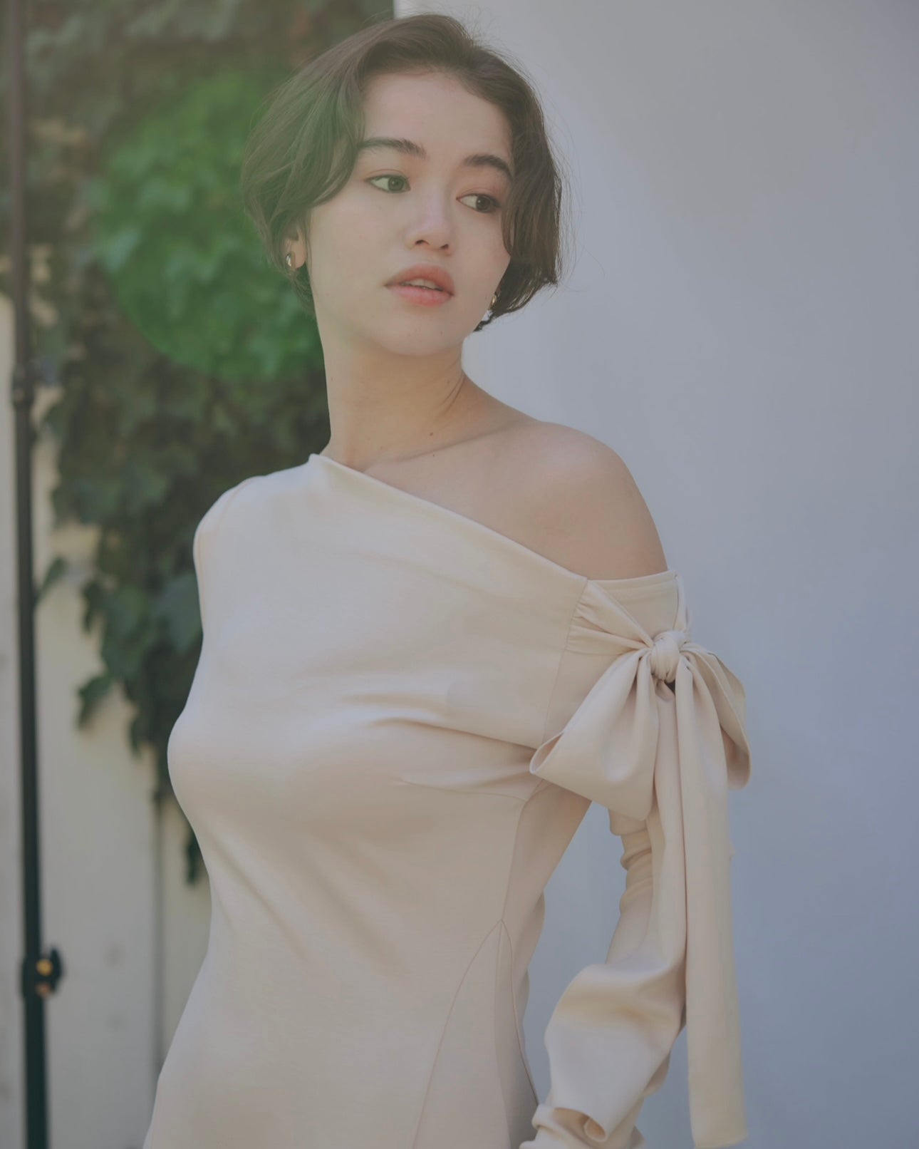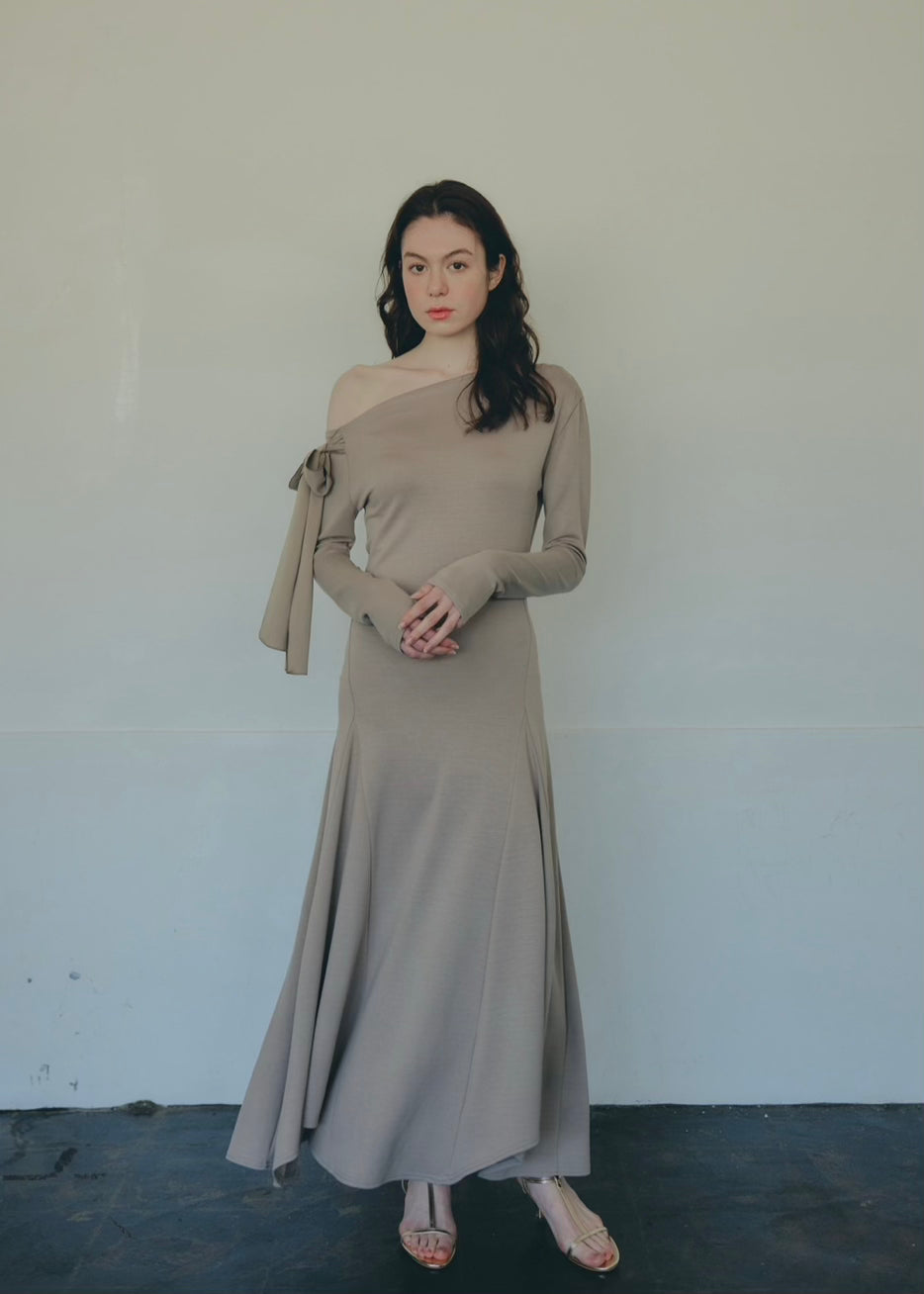 片方の肩にたっぷりとしたリボンをあしらい、
