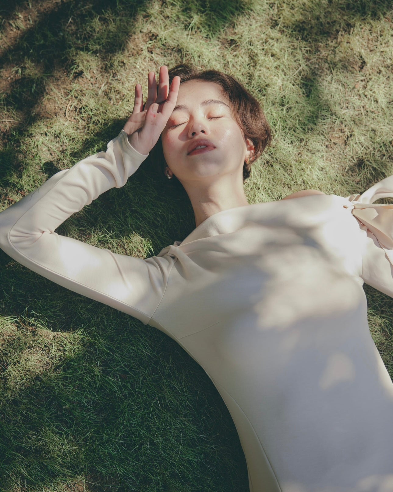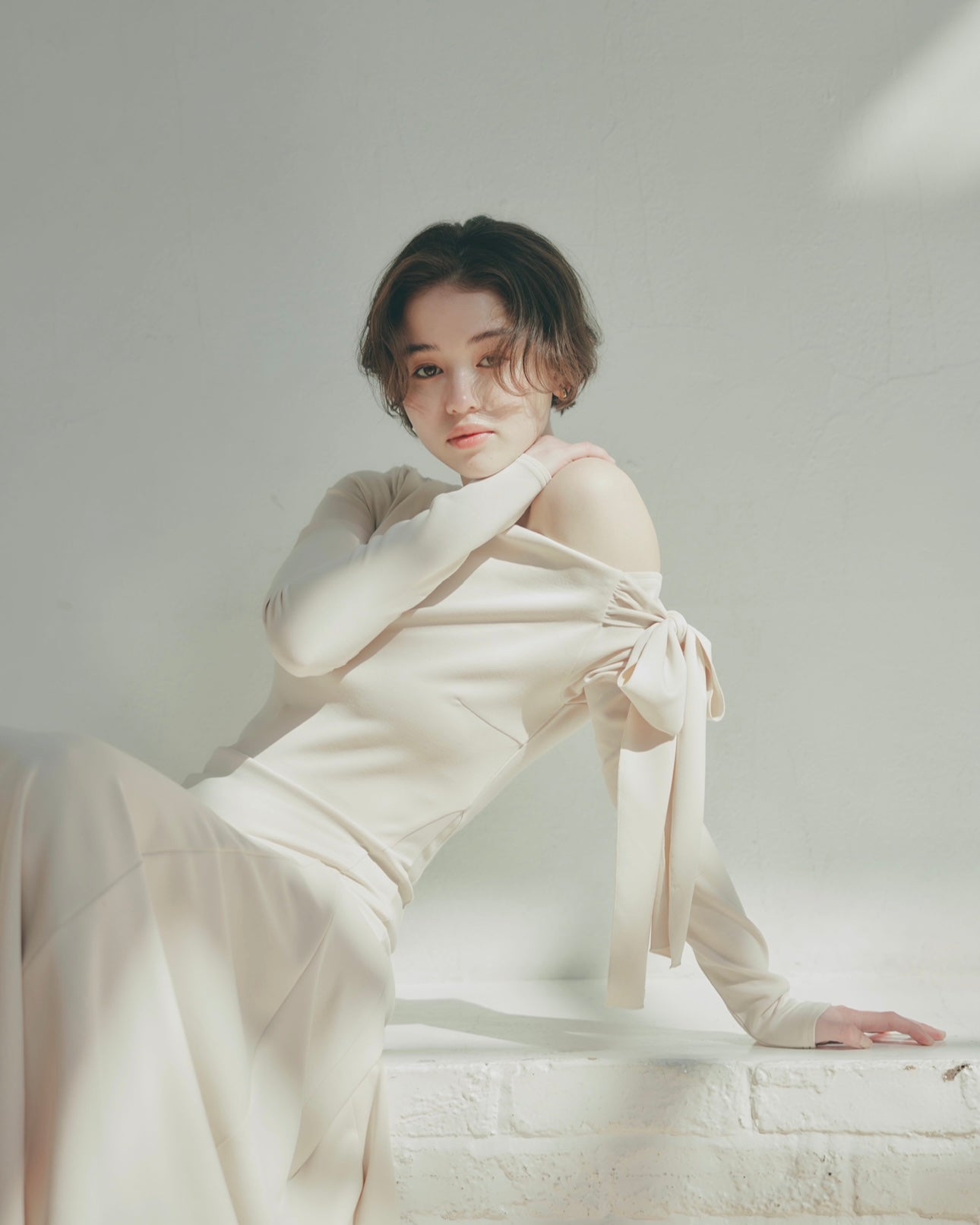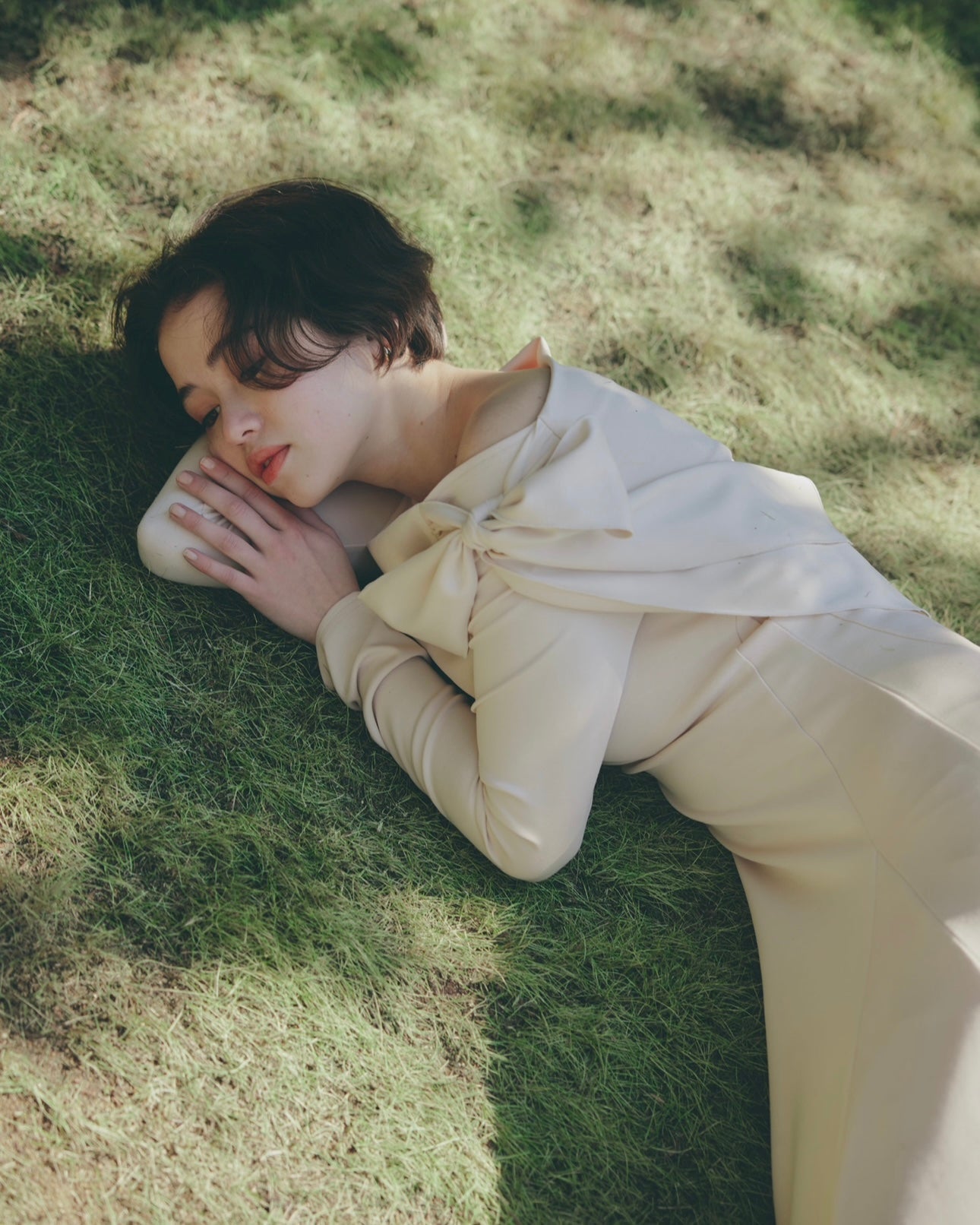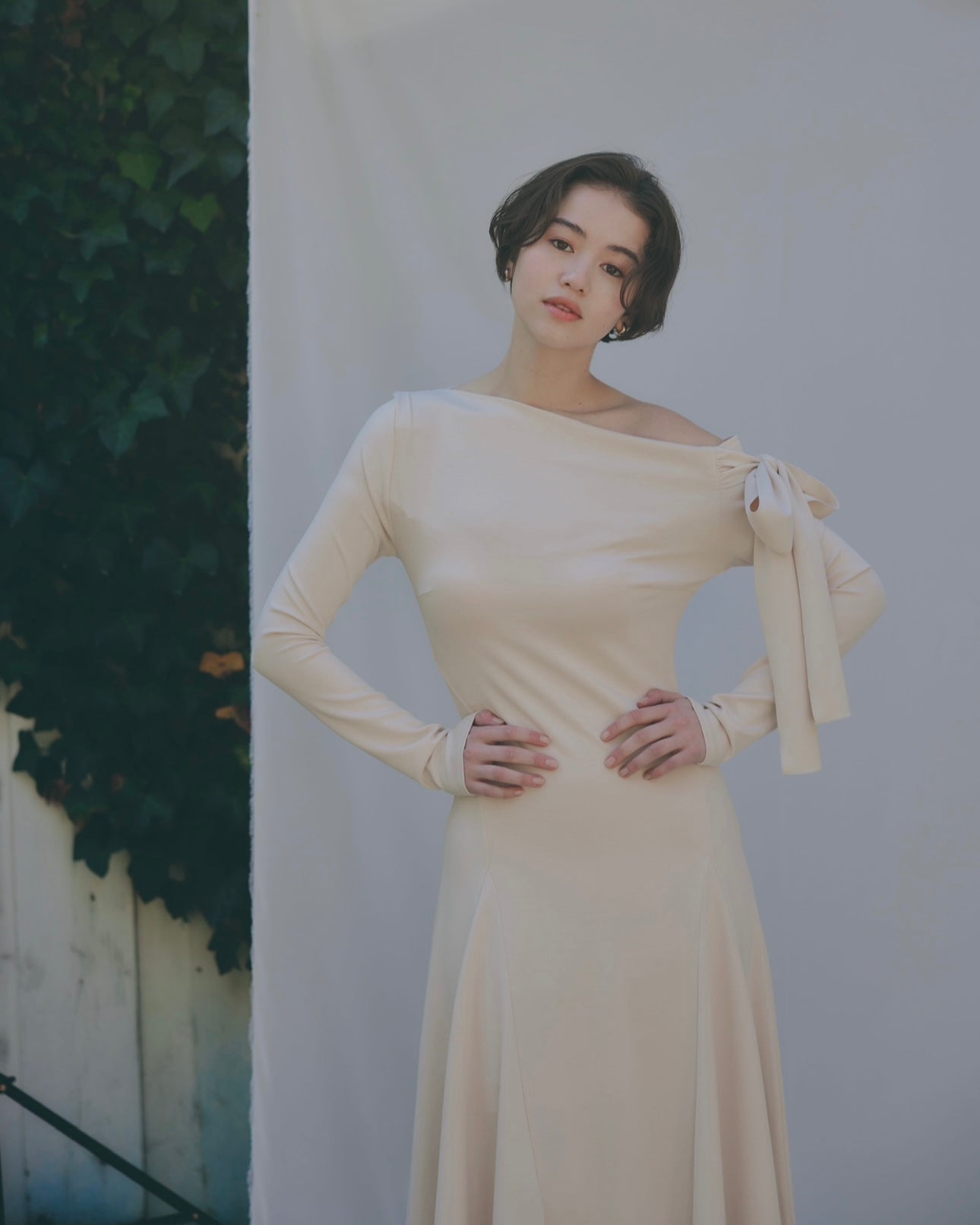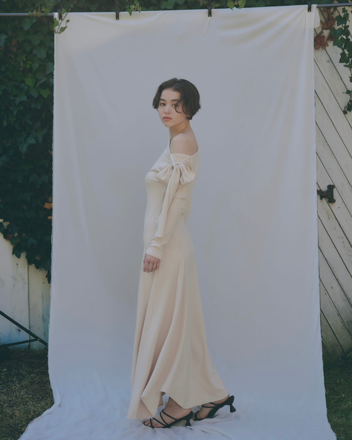 片方の肩にたっぷりとしたリボンをあしらい、