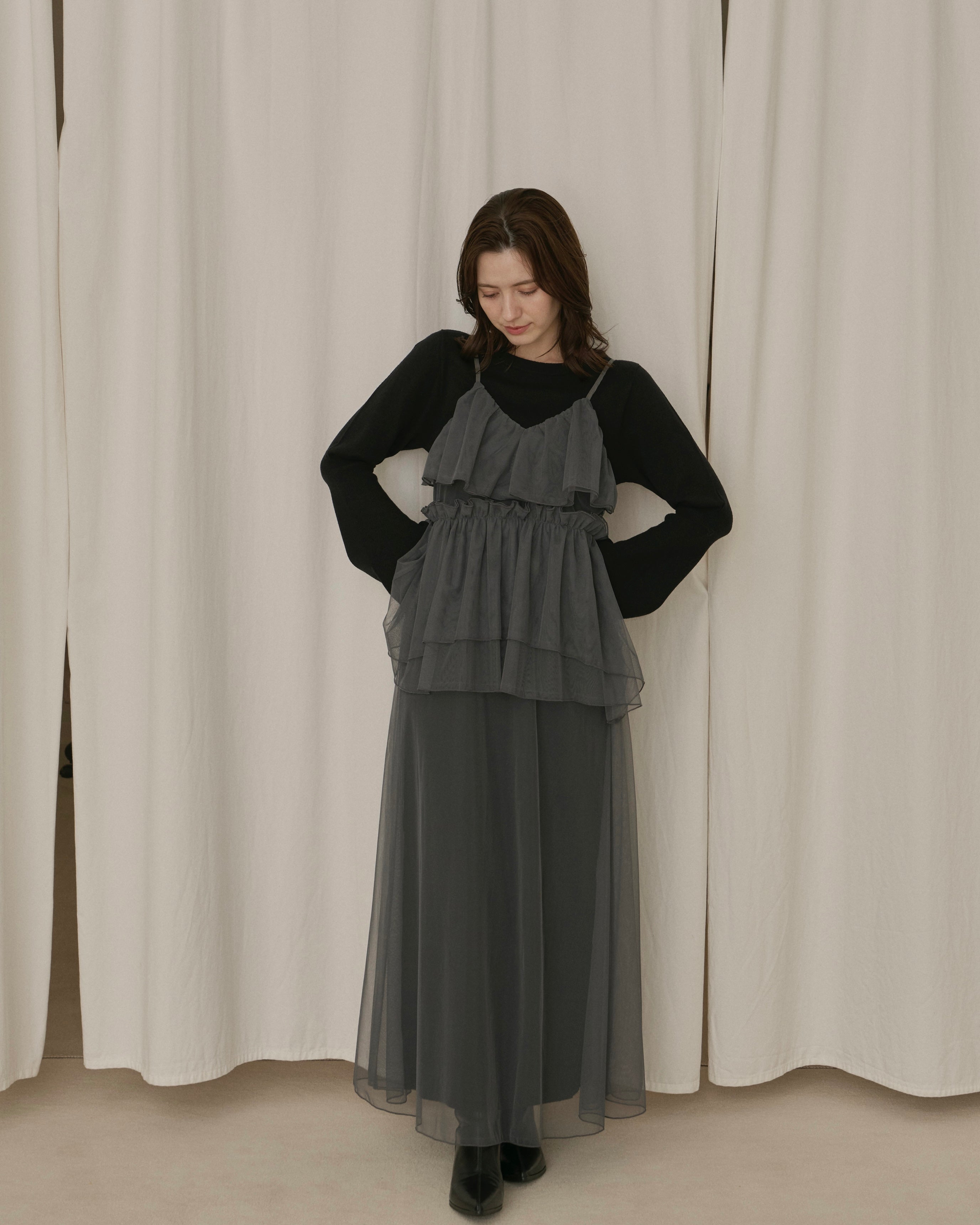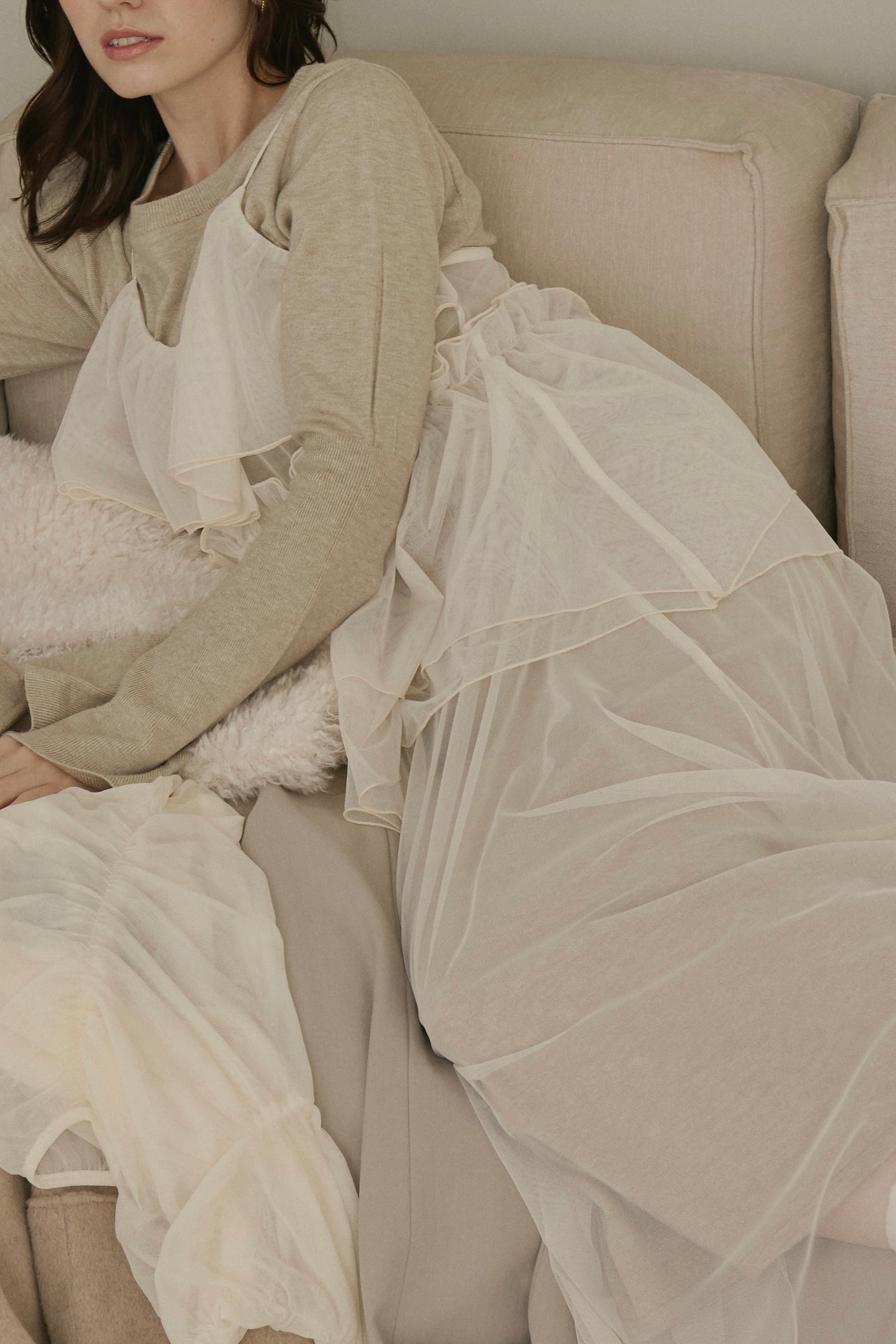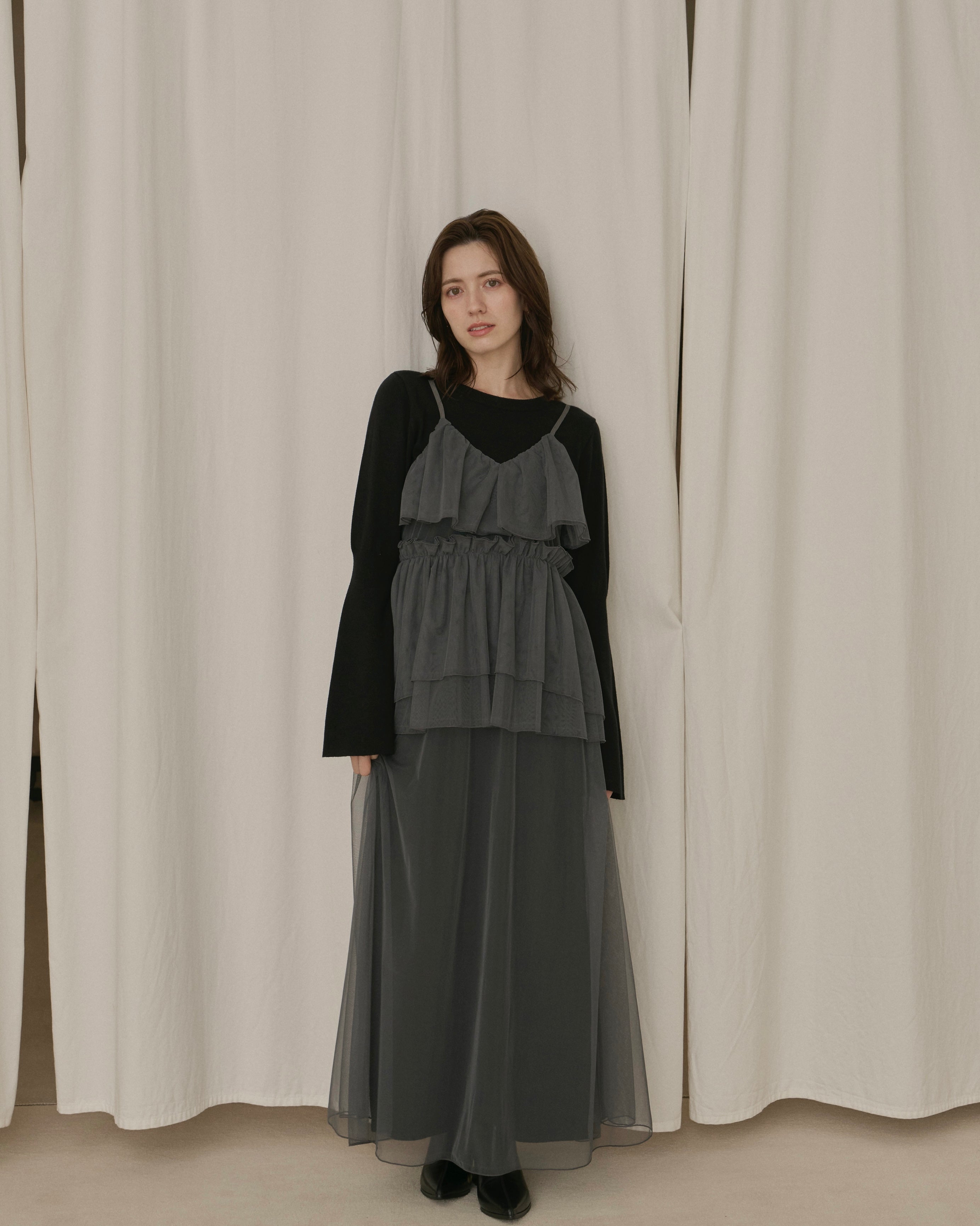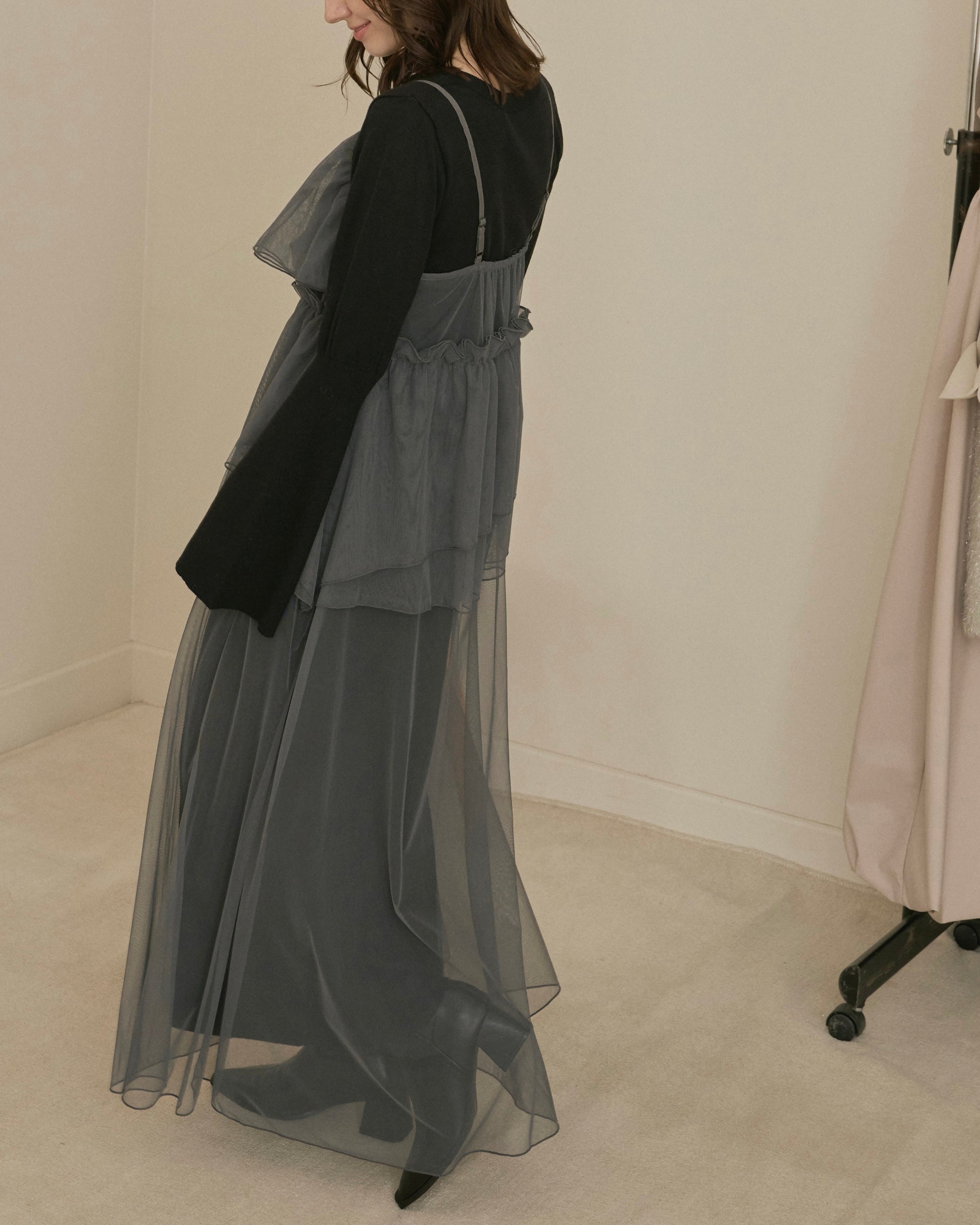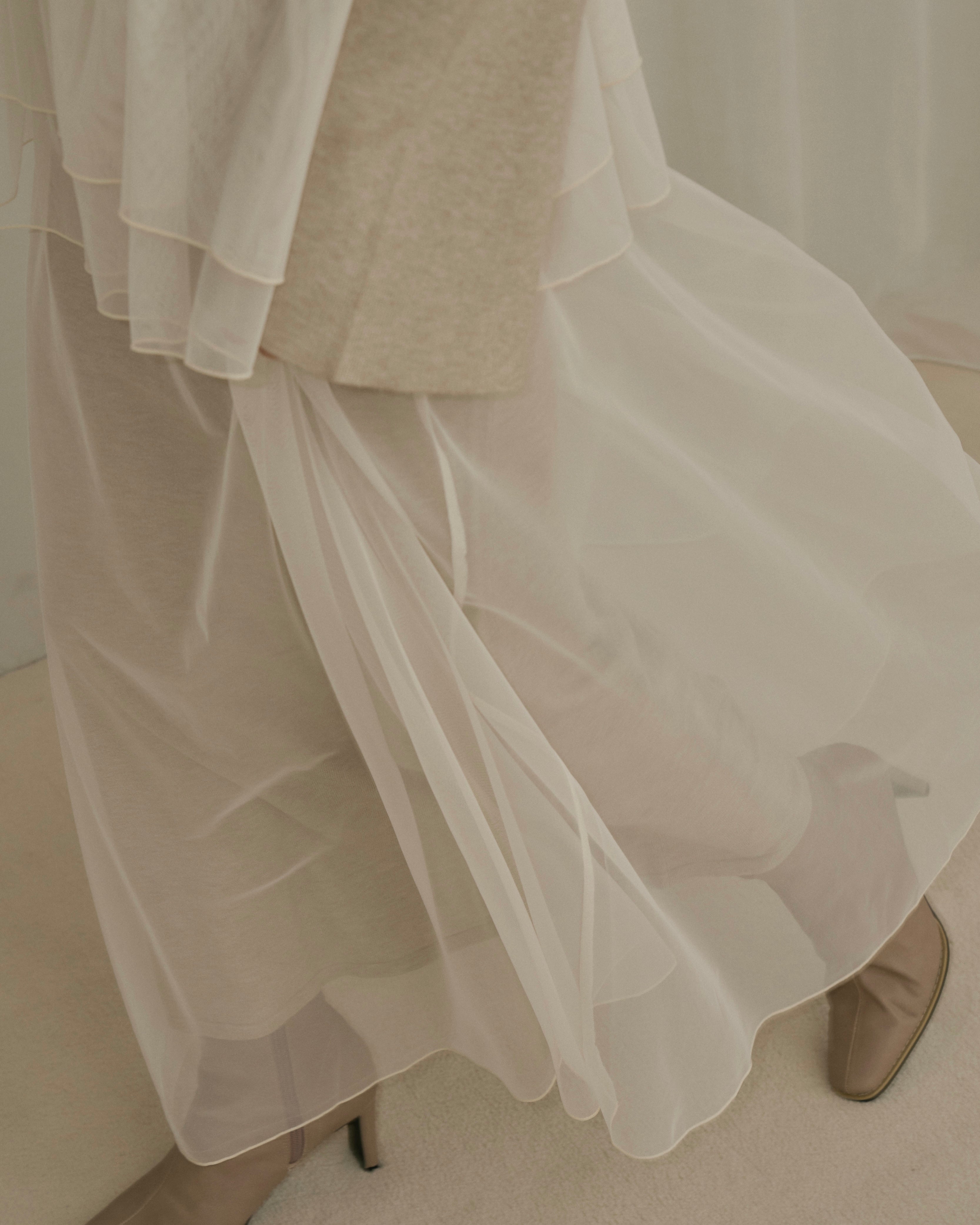 動くたびに軽やかに揺れる重なったチュール素材が、