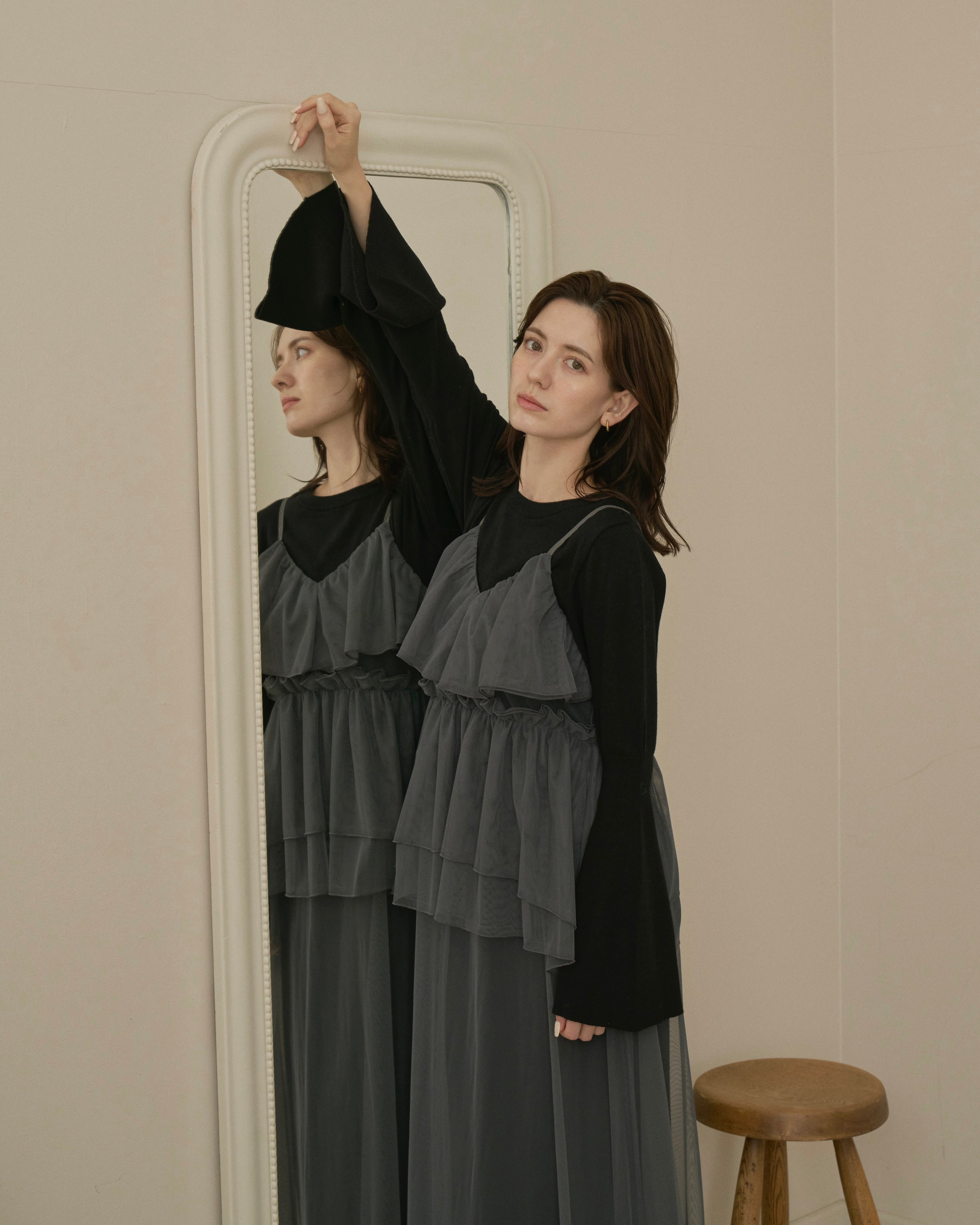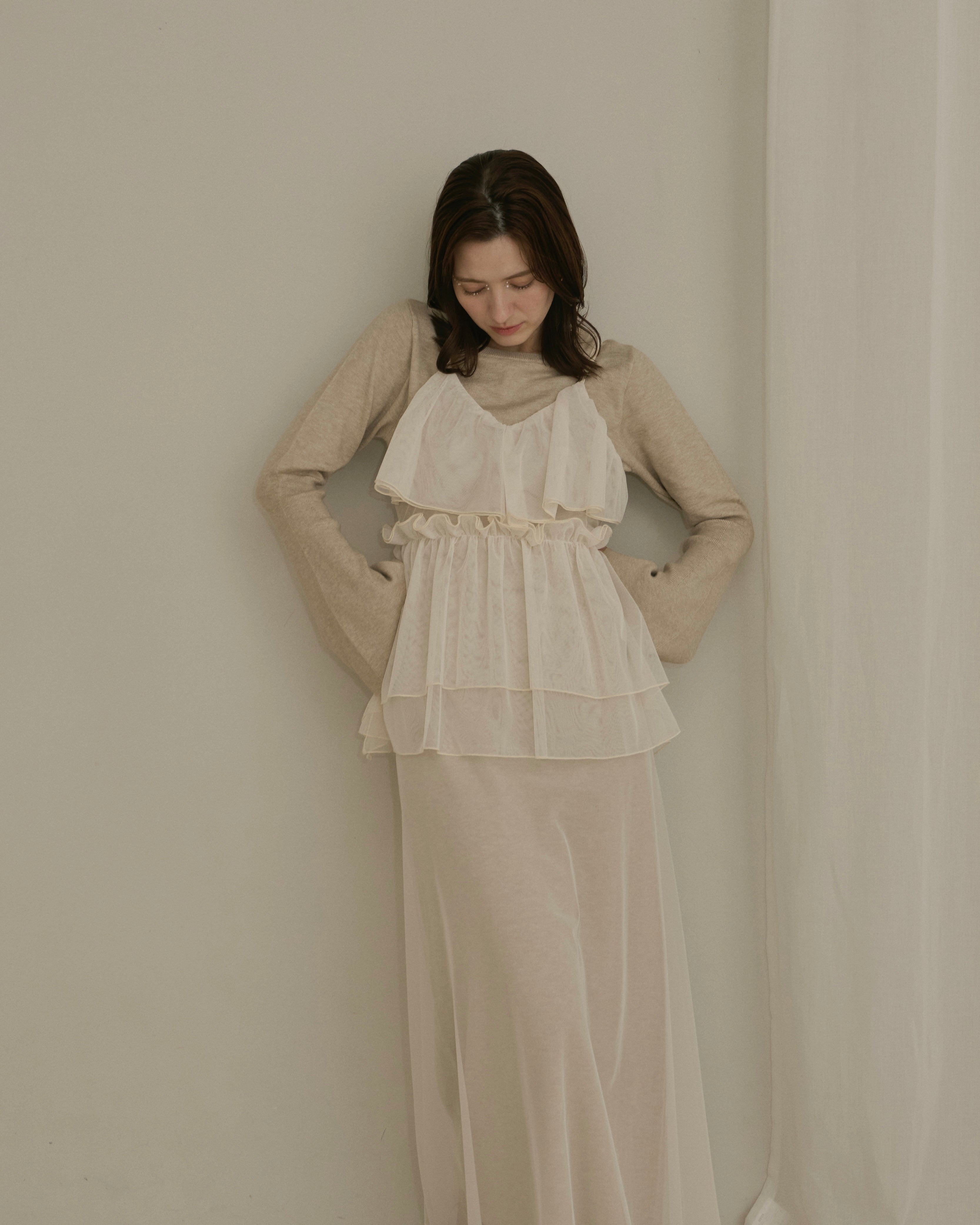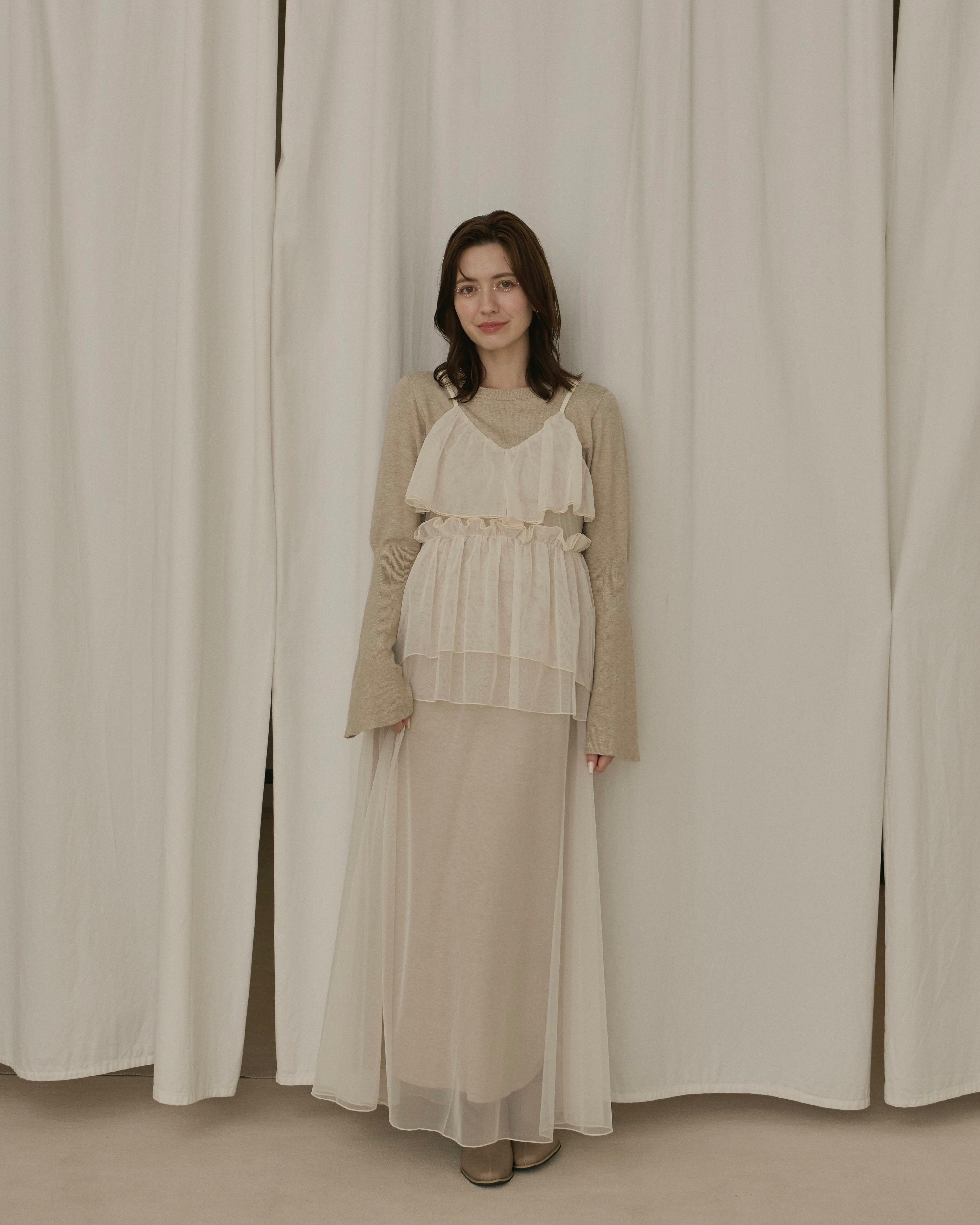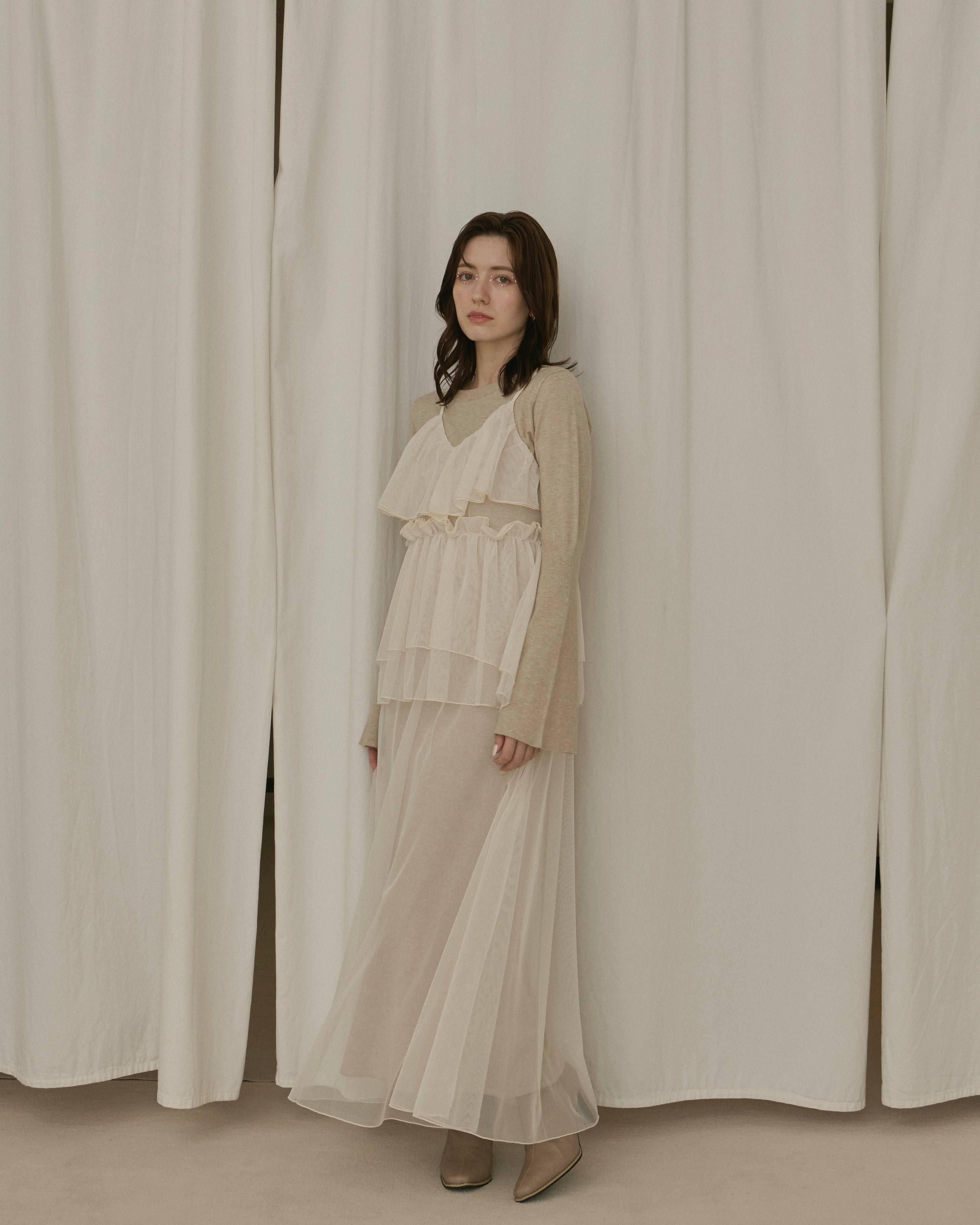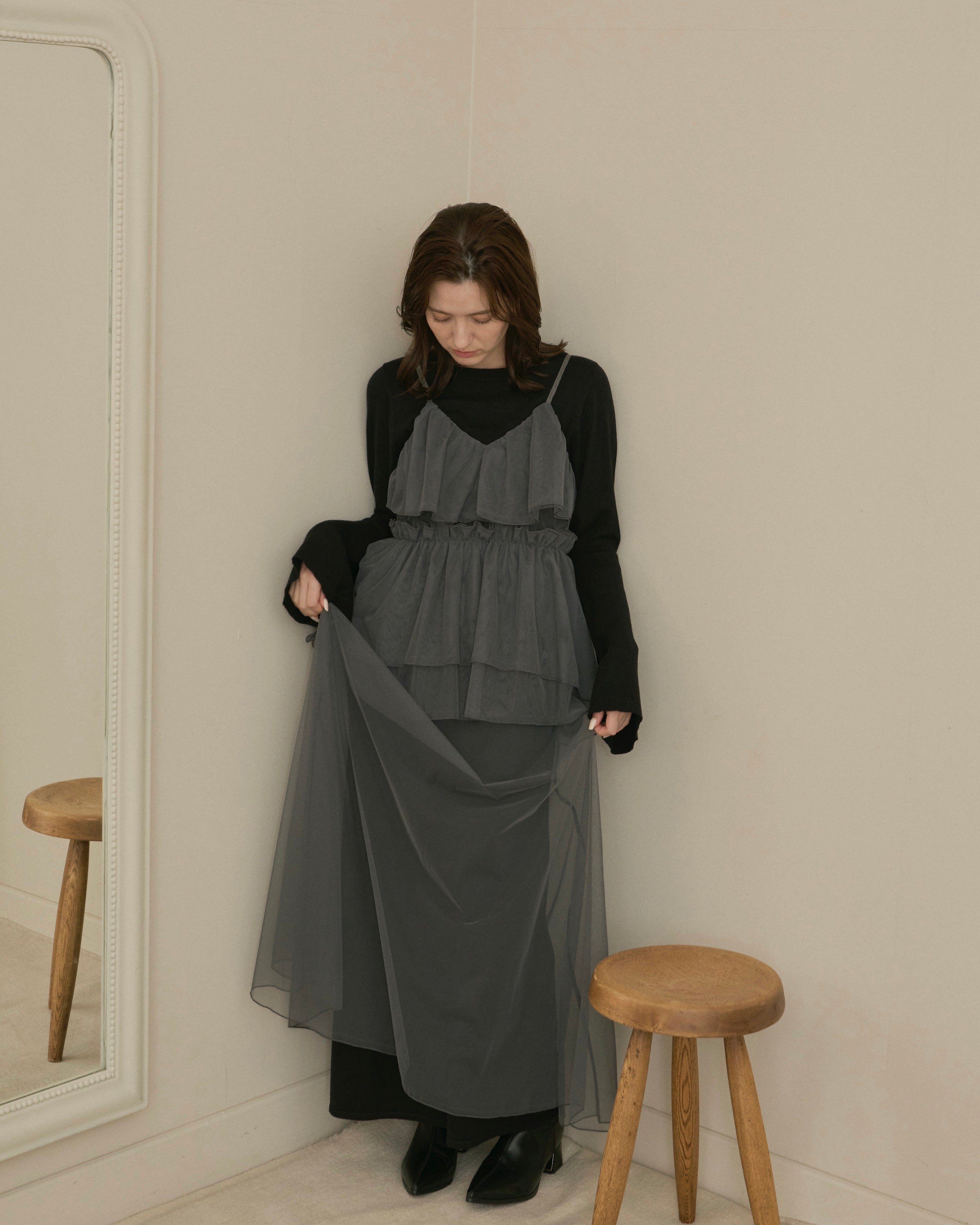 動くたびに軽やかに揺れる重なったチュール素材が、