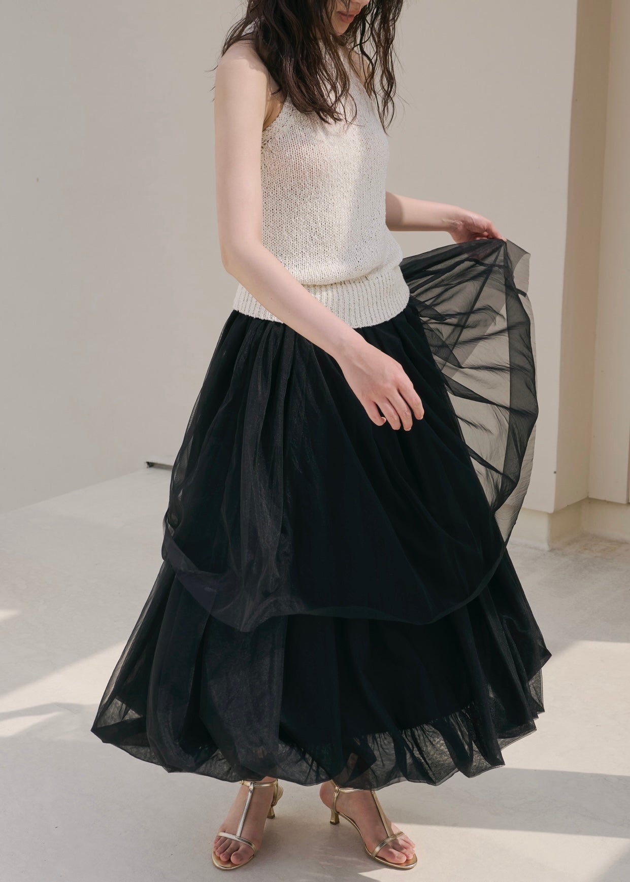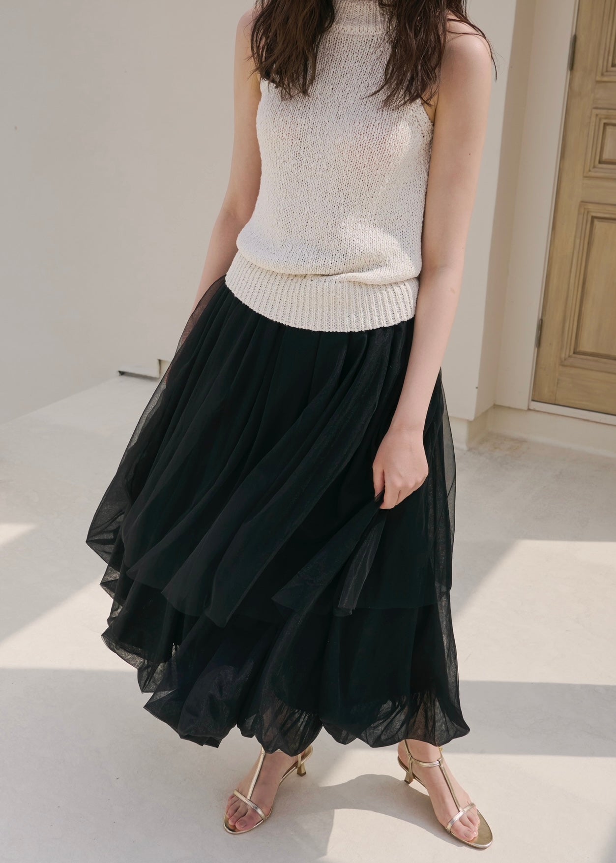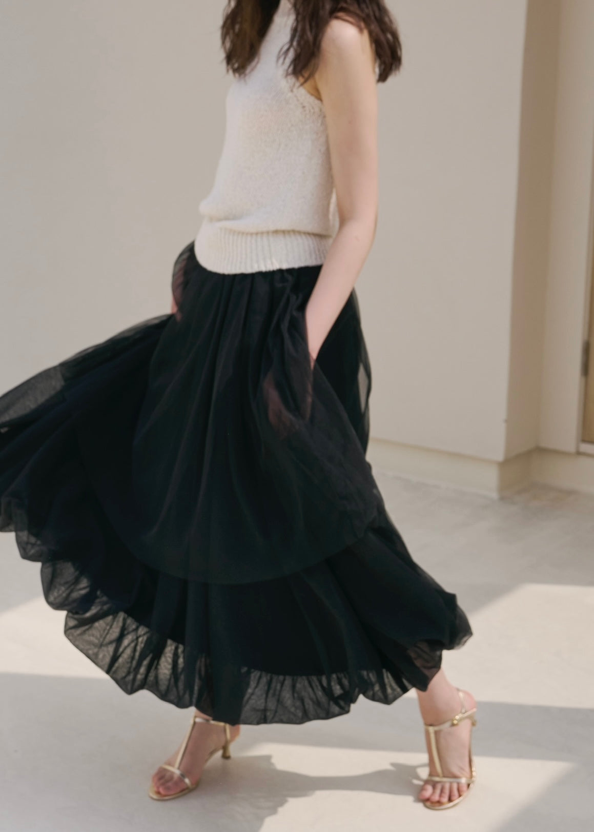 歩くたび、風を纏って浮かぶように揺れるシルエットのチュールスカート。