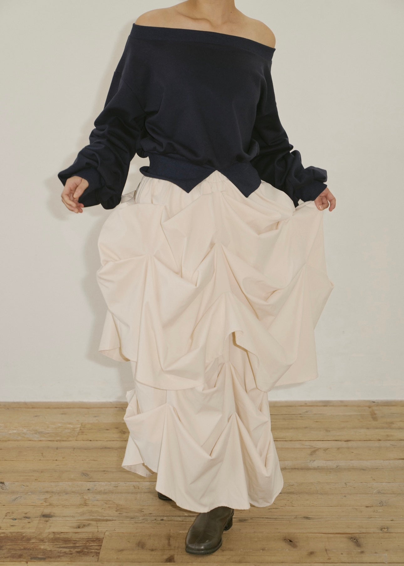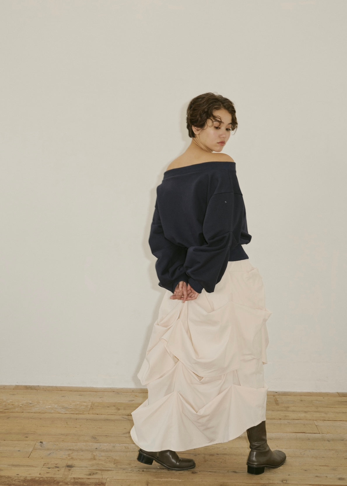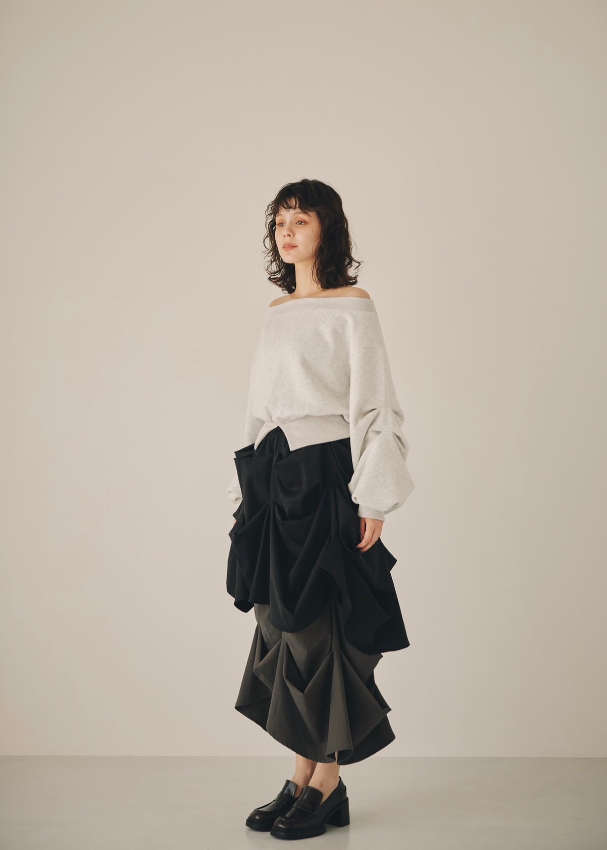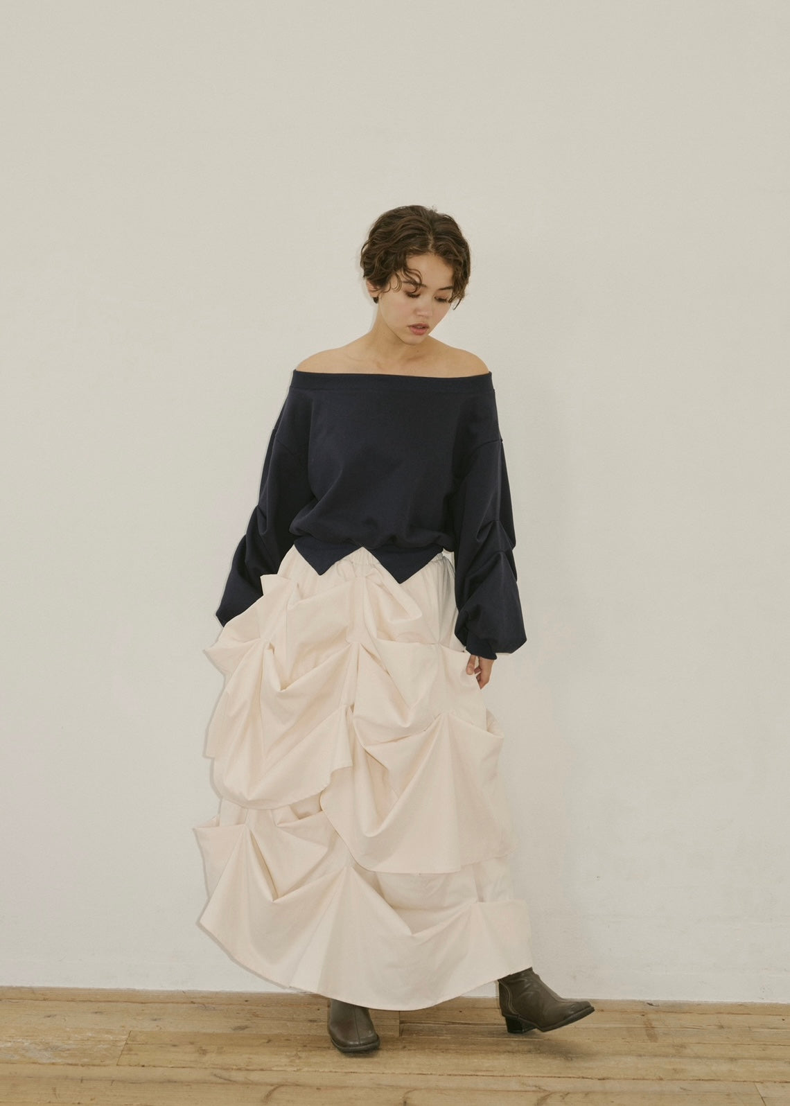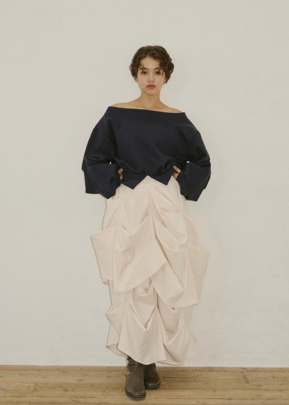 モードとフェミニンの境界を遊ぶ一枚。