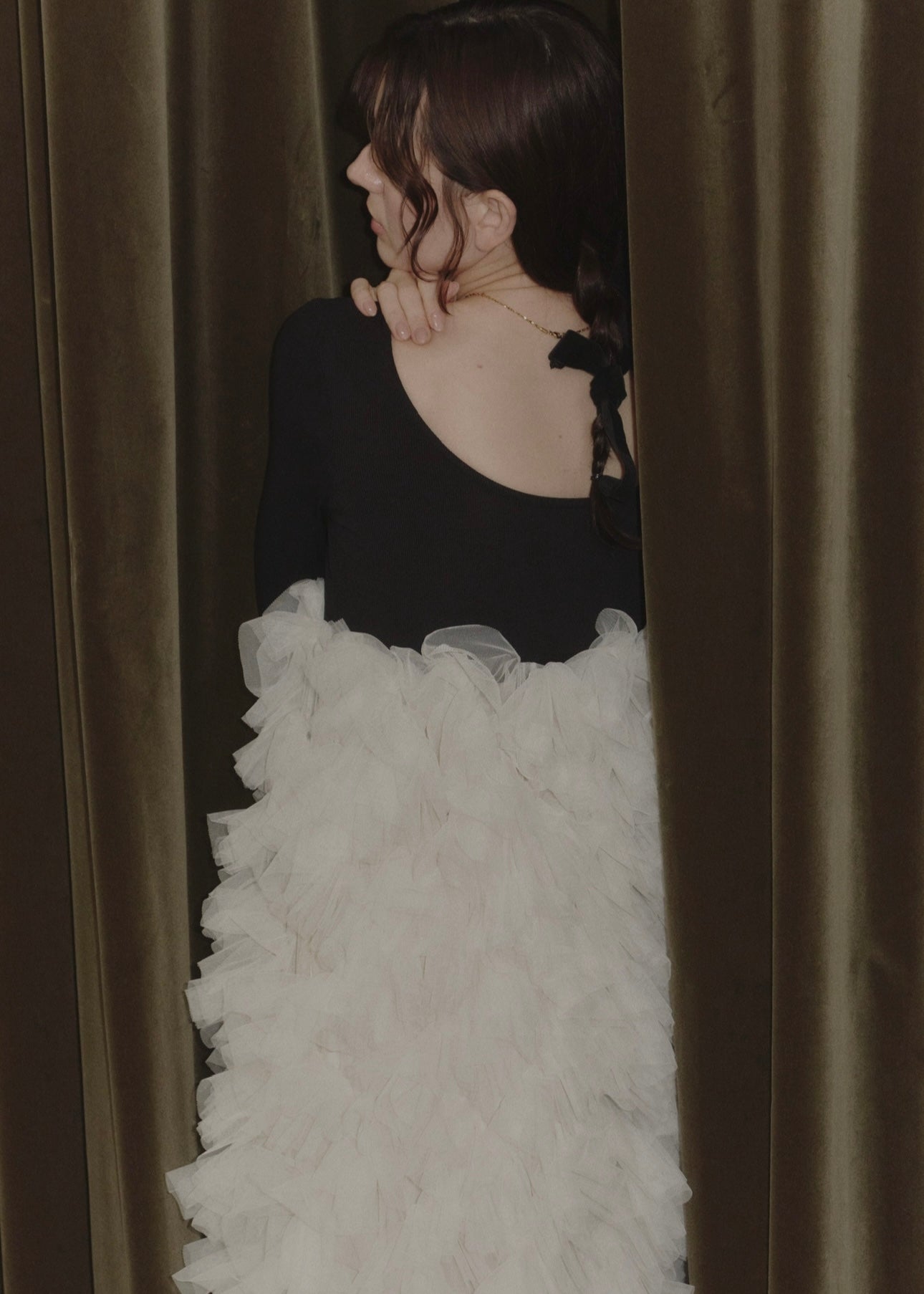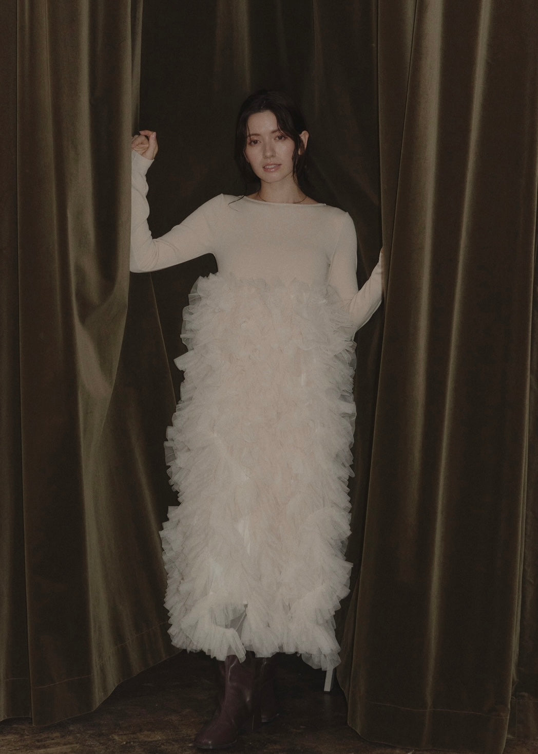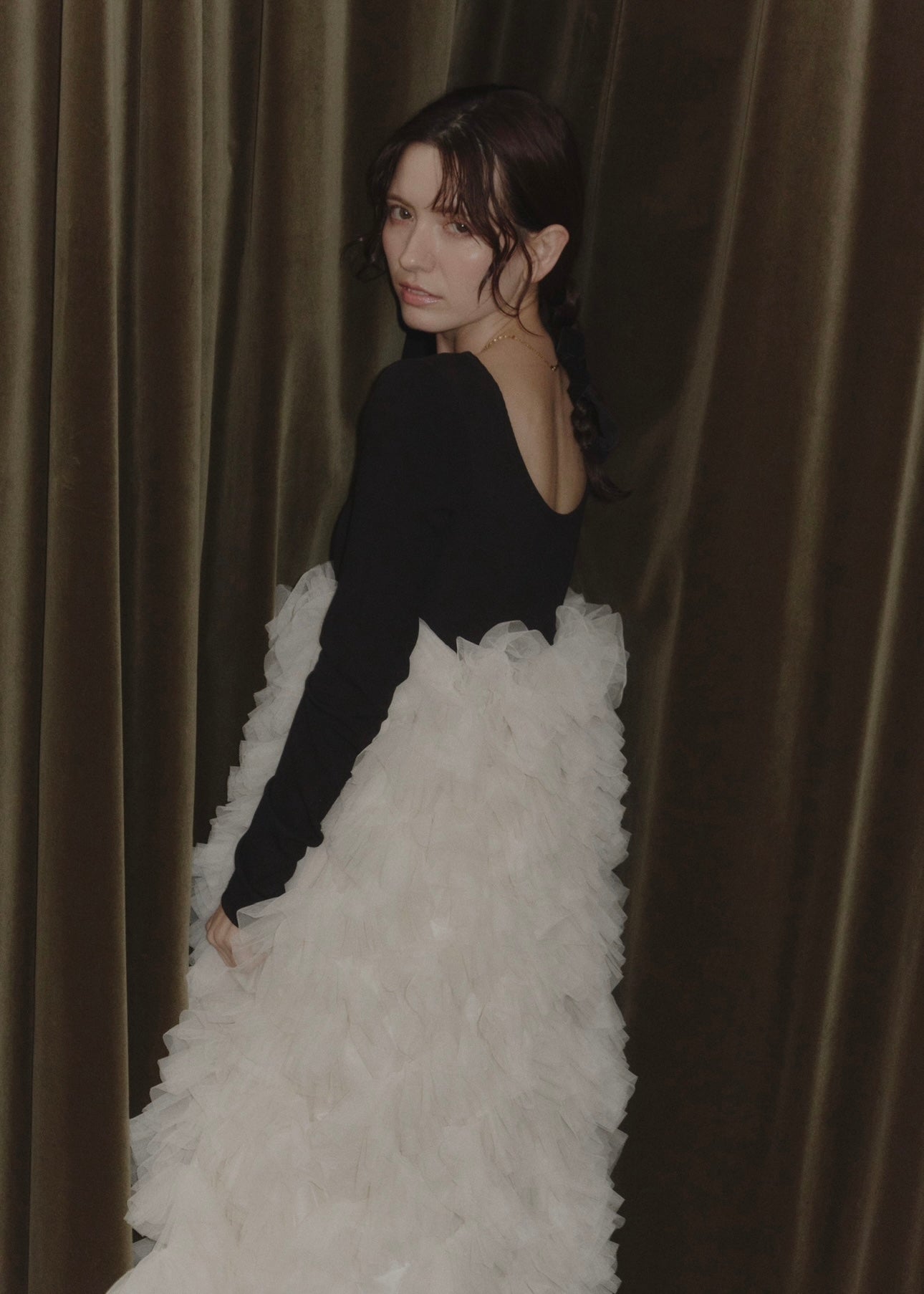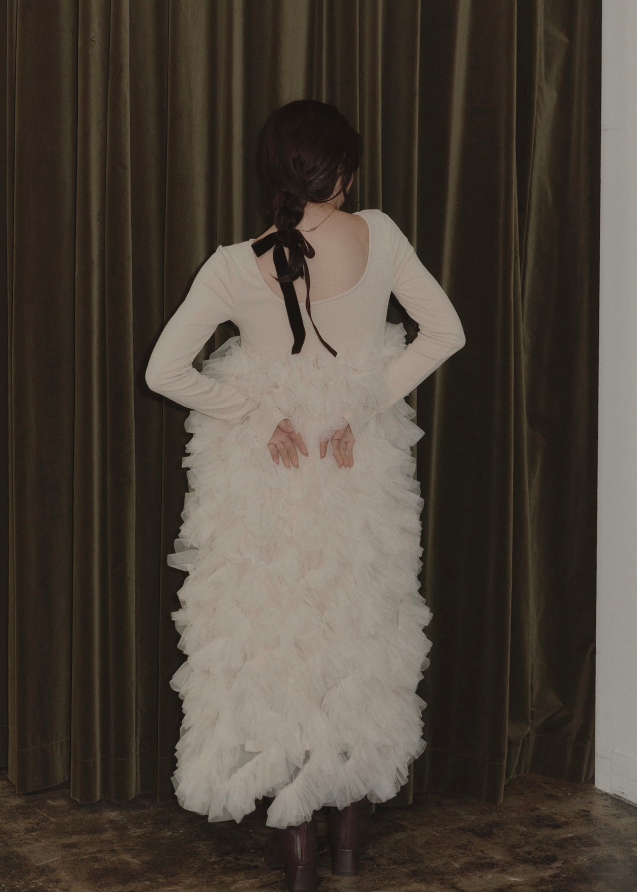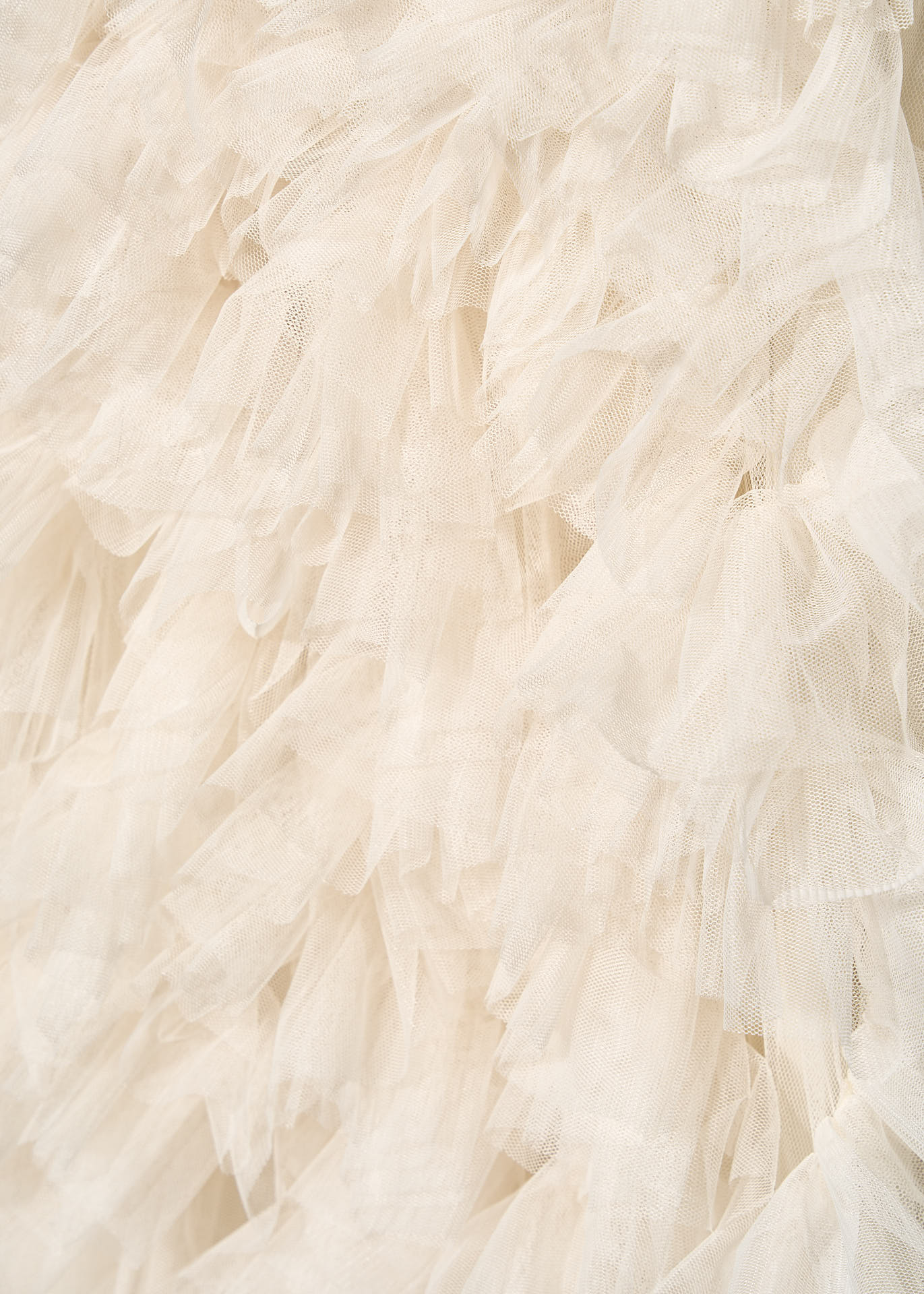 足元にかけてふんだんに波打つチュールで