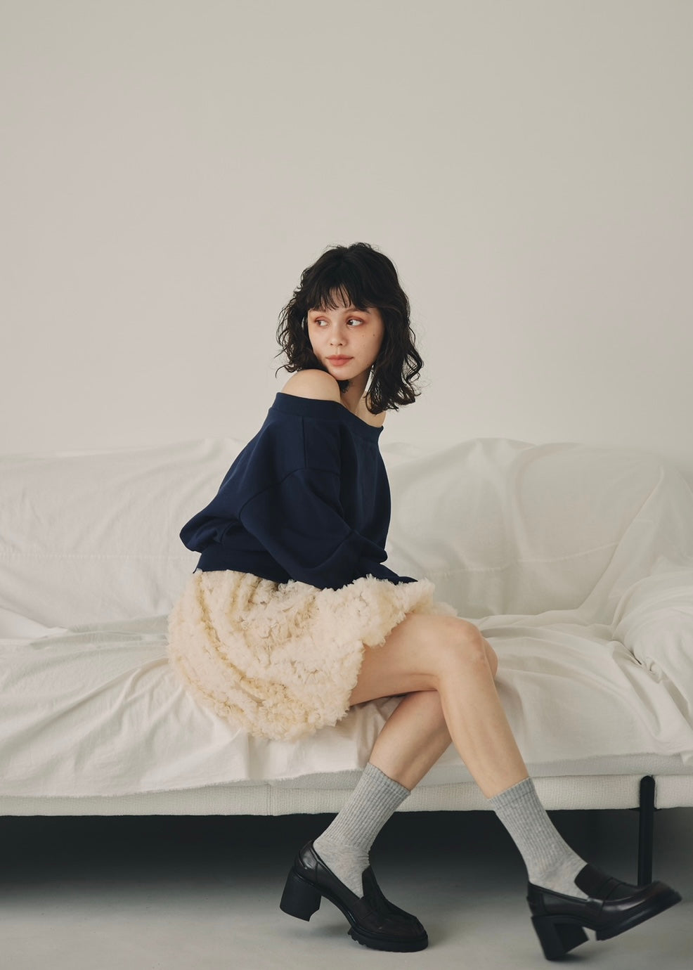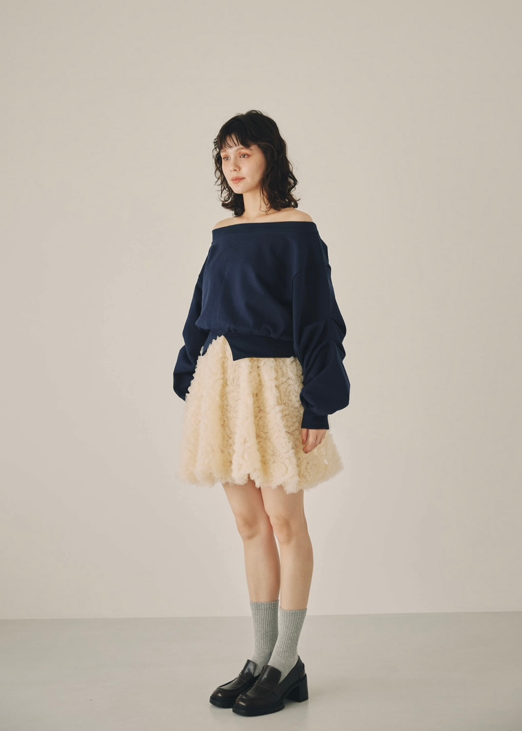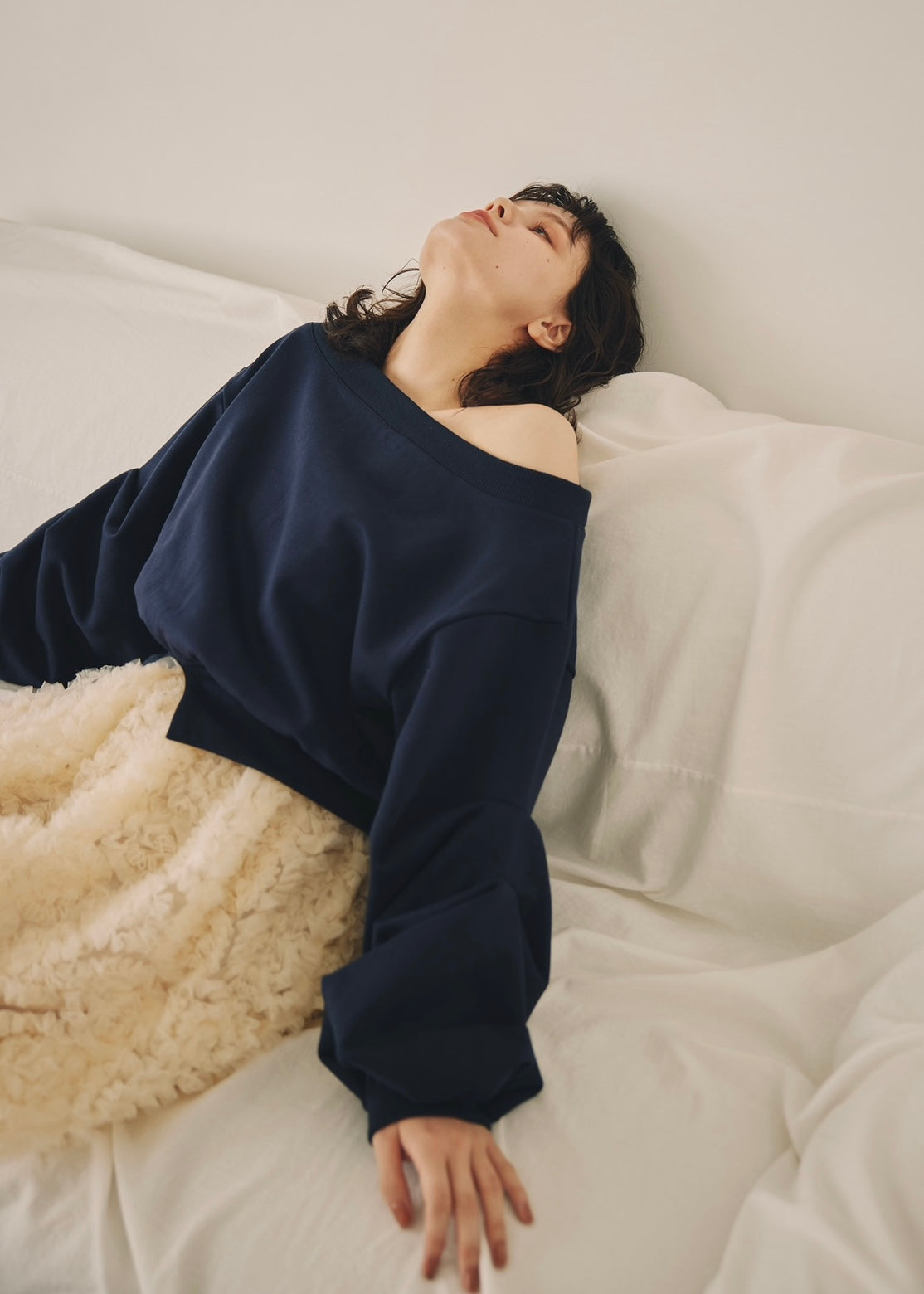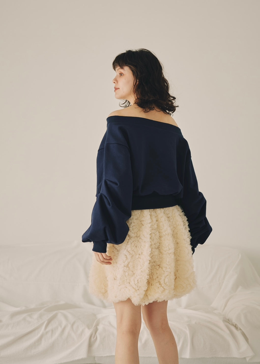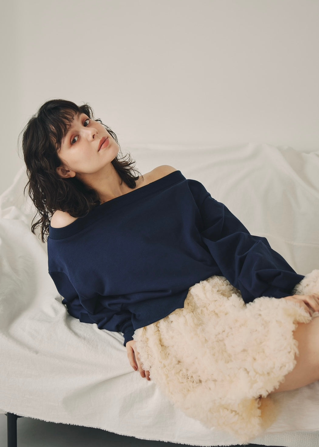 ほどよい抜け感を演出するオフショルダーデザインと