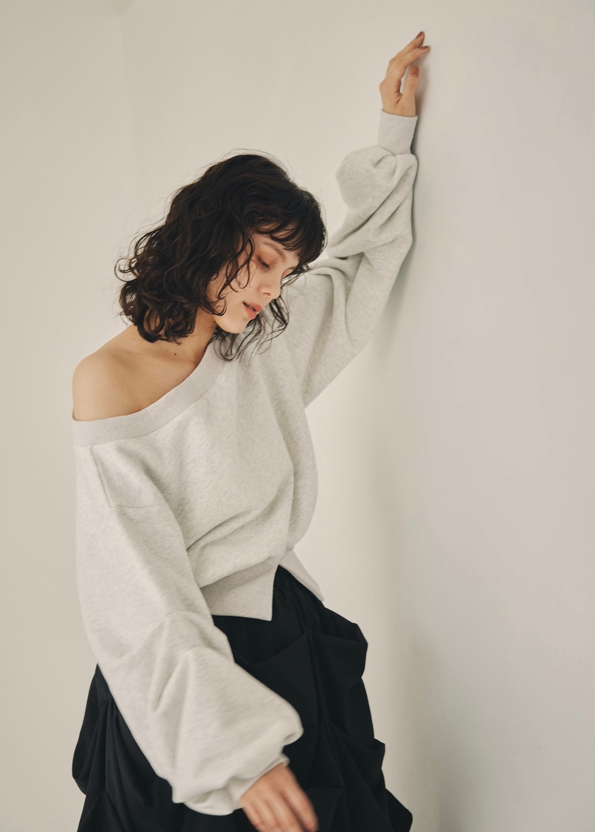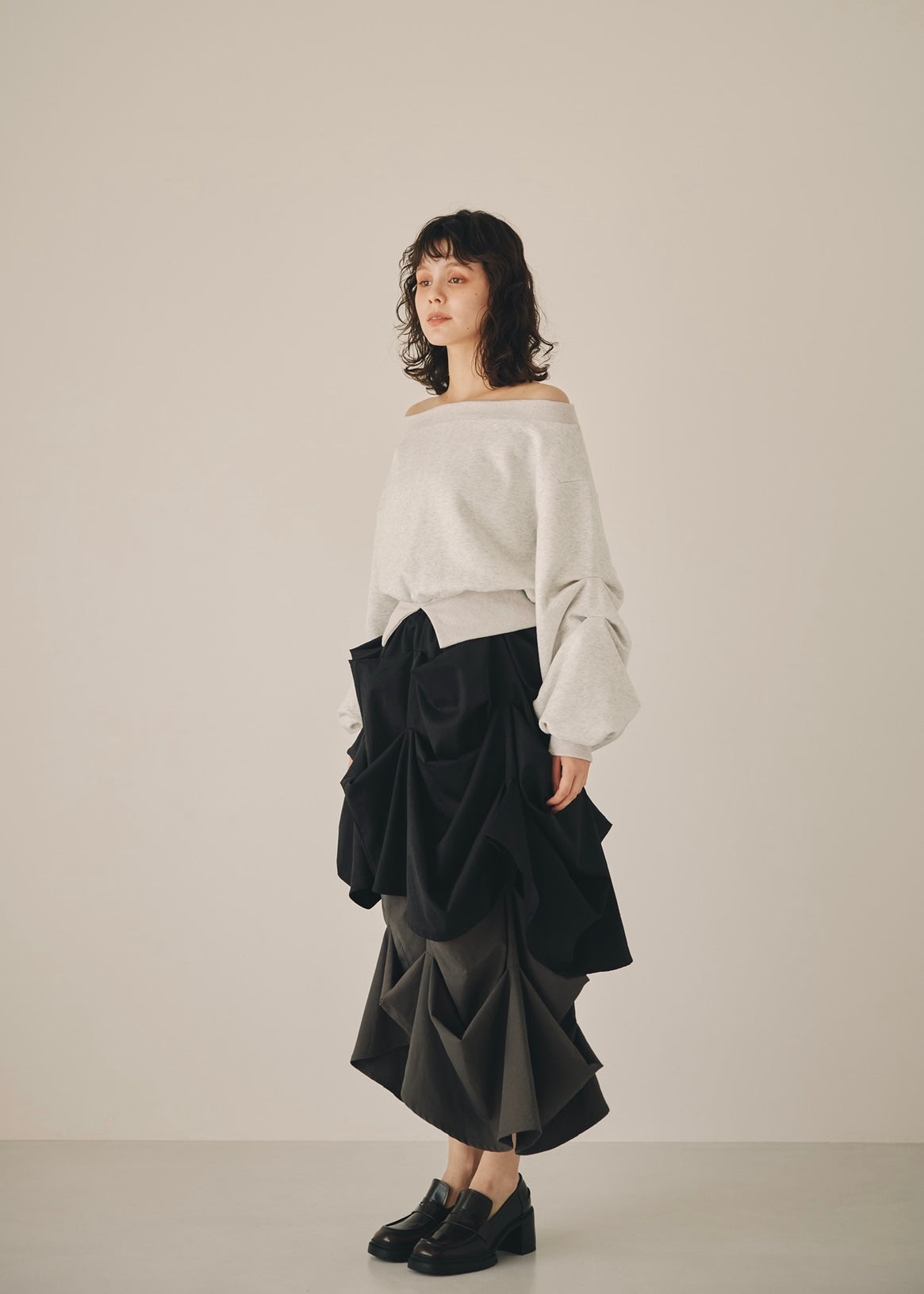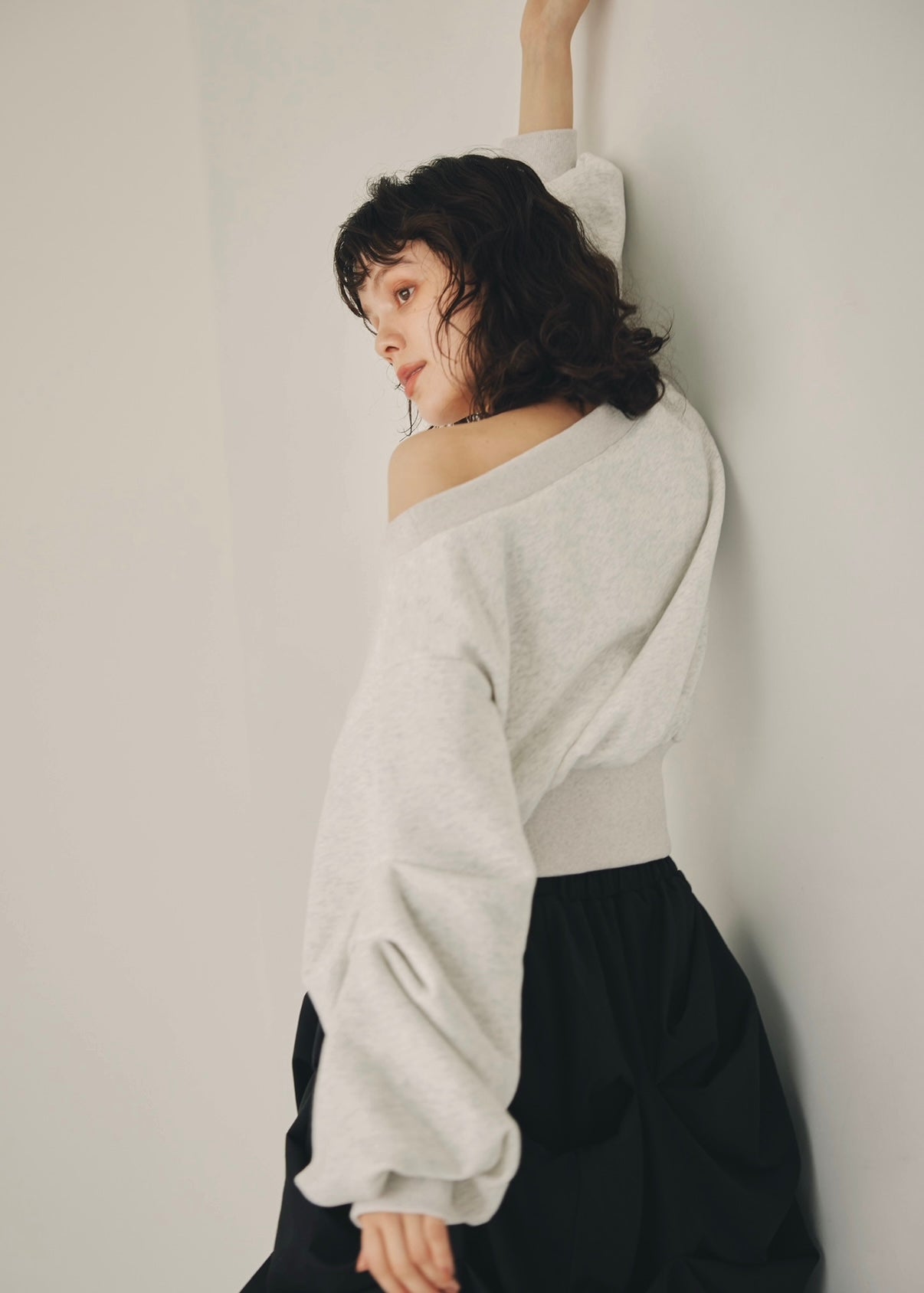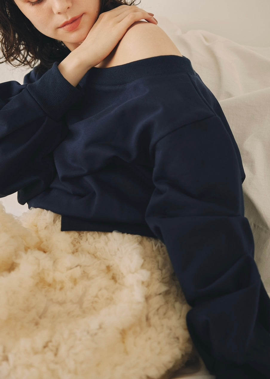 たっぷりと入ったタックが生み出すボリュームスリーブが、魅力のトレーナー。