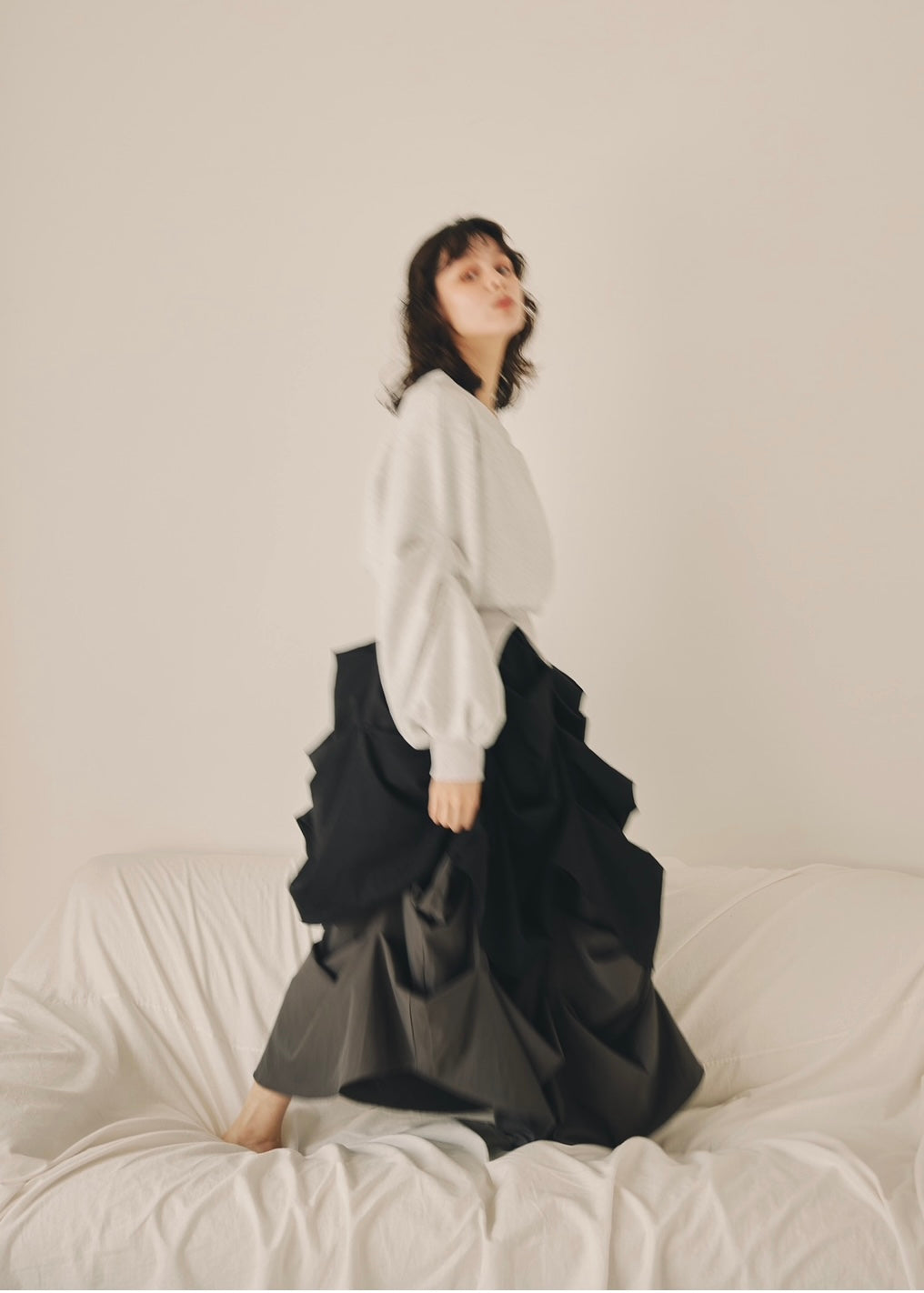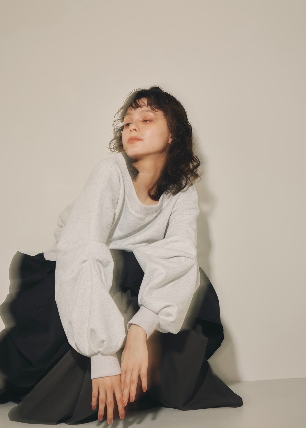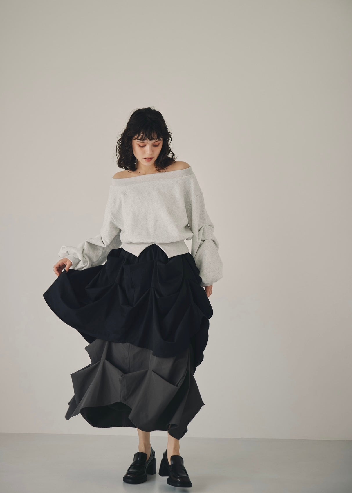 たっぷりと入ったタックが生み出すボリュームスリーブが、魅力のトレーナー。